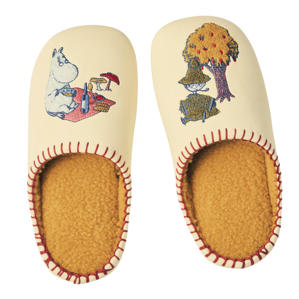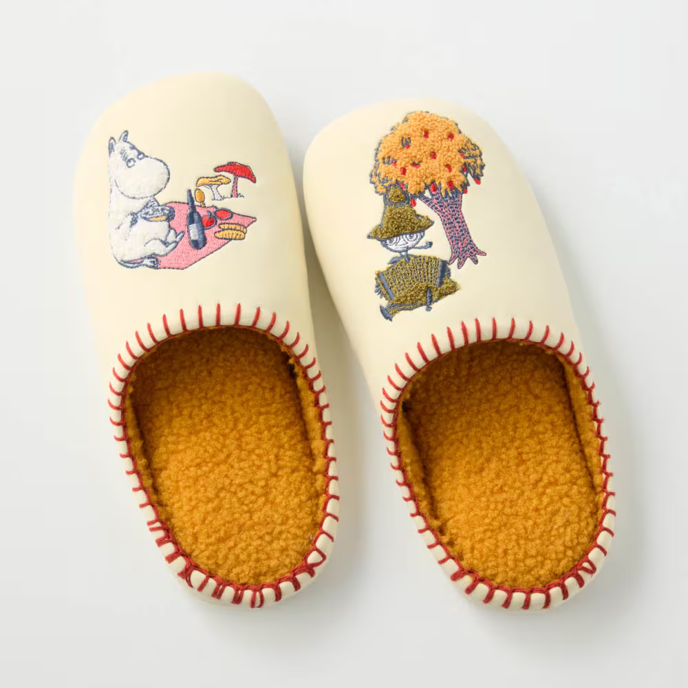 「ムーミン&スナフキン」デザインは、淡いベージュにこっくりとしたオレンジのボアがかわいらしいスリッパ。