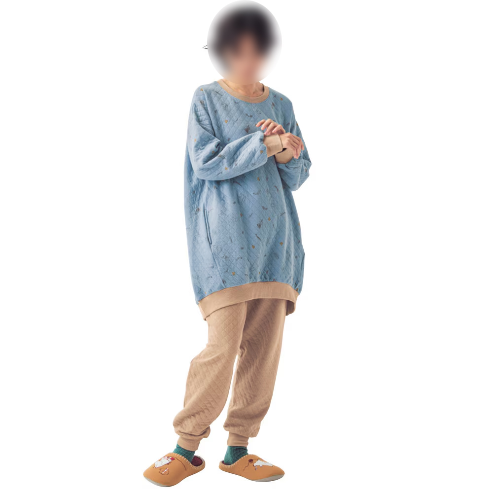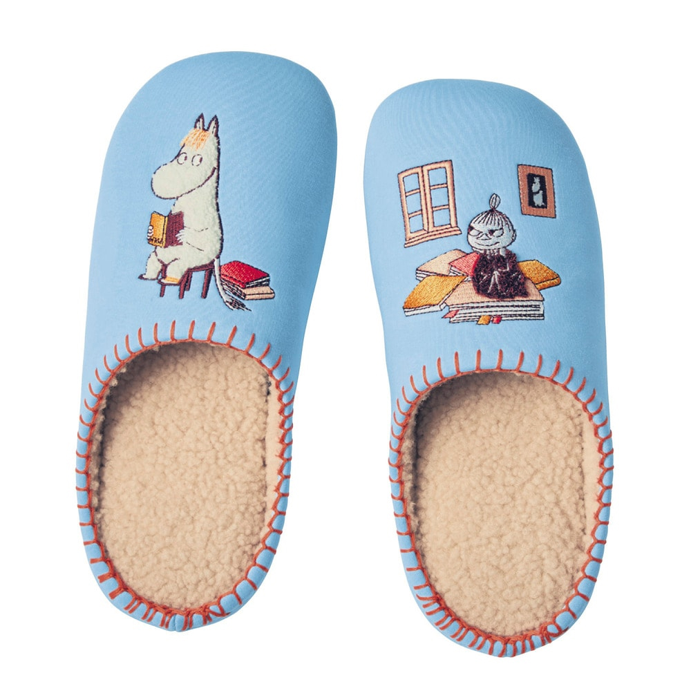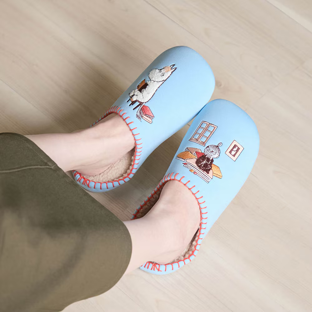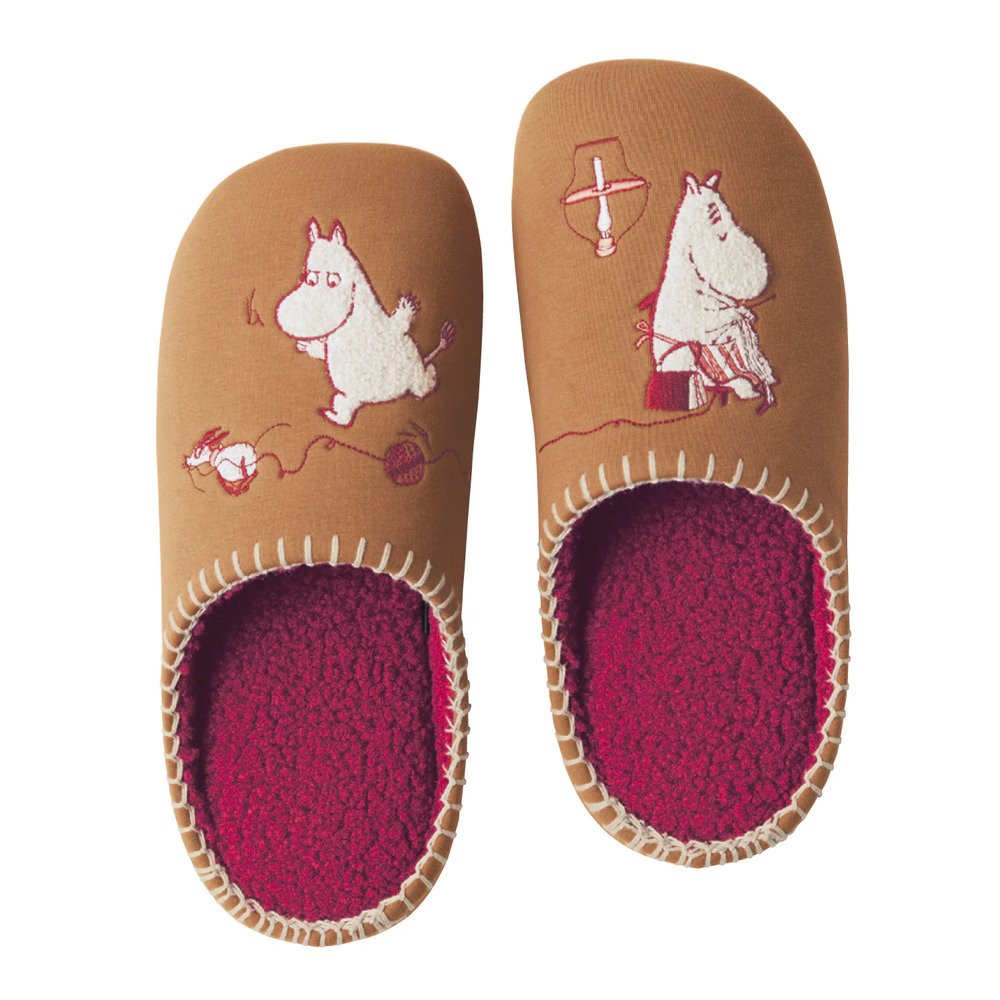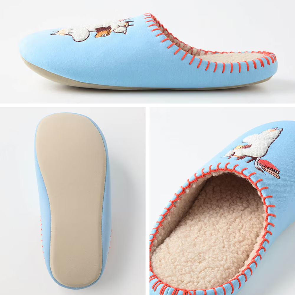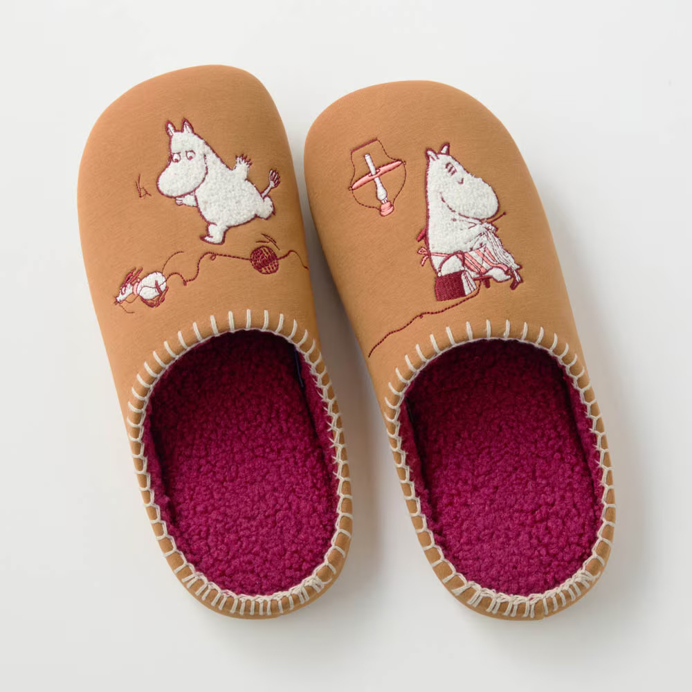 「ムーミン」たちのサガラ刺繍と、絶妙なカラーで合わせたブランケットステッチがおしゃれな、ウレタン入りのボアスリッパ!