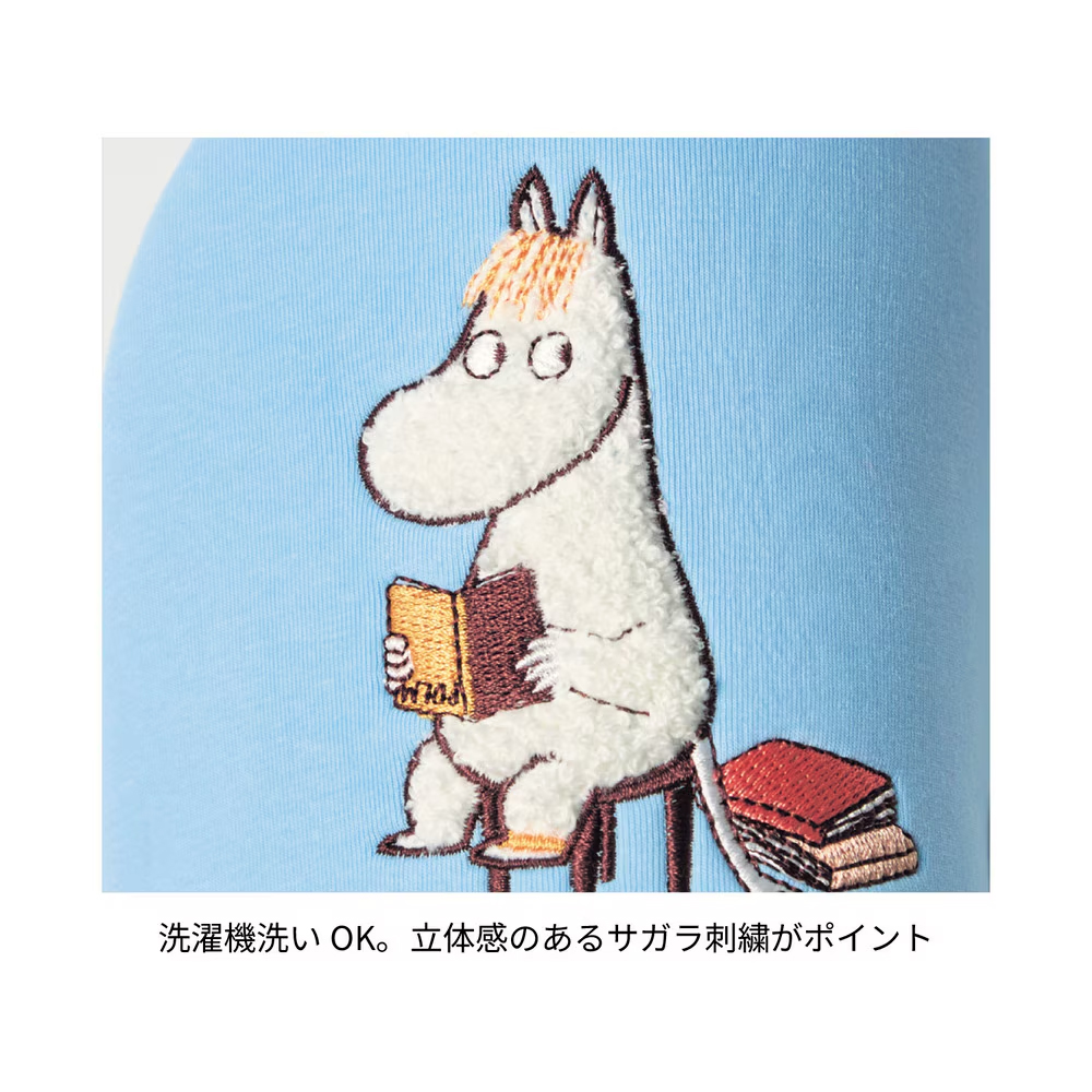 「読書の秋」を満喫する「スノークのおじょうさん」と本の上でいたずらっぽく笑う「リトルミイ」の、作品のワンシーンを思わせるようなイラストが刺繍されています。