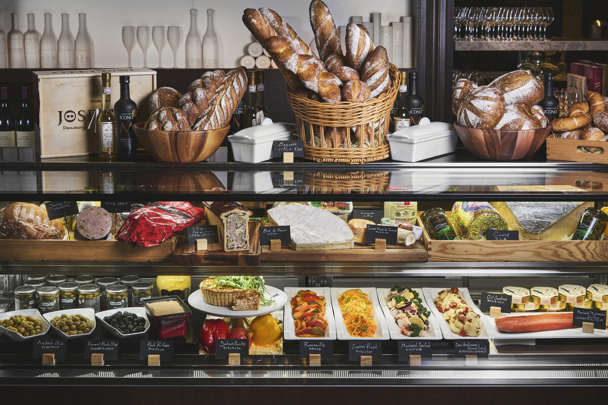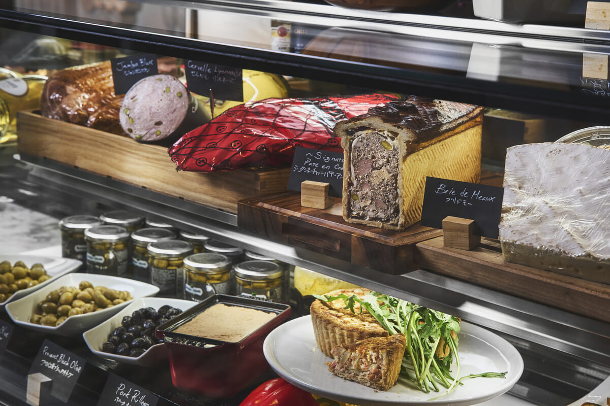 熟成の妙が光るアーティザナルチーズや彩り豊かなフレンチ総菜、飯塚 隆太シェフのシグネチャーディッシュ「パテ アン クルート」など、個性豊かな前菜が並ぶショーケース。