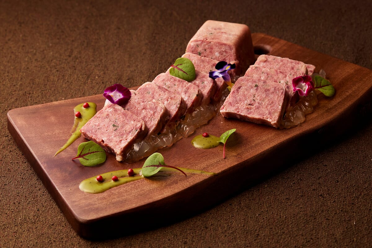 ハーブマスタードとリンゴのゼリーと合わせて味わう蝦夷鹿のテリーヌやカニとロブスターのクリームコロッケ、