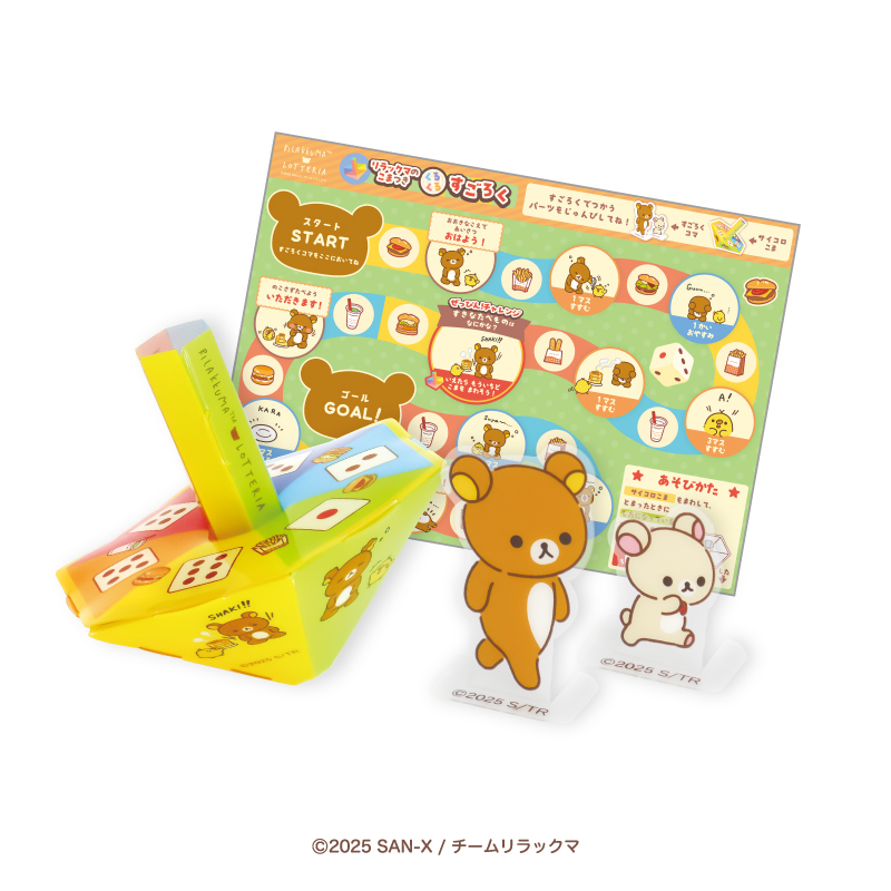 おもちゃは「リラックマのテレビBOXつき おりがみレター」「リラックマのだいすきな ホットケーキだるま」「リラックマのこまつき くるくるすごろく」の3種類から1種類を選ベます☆