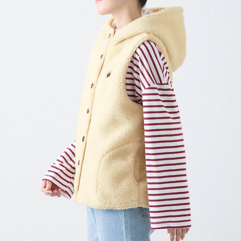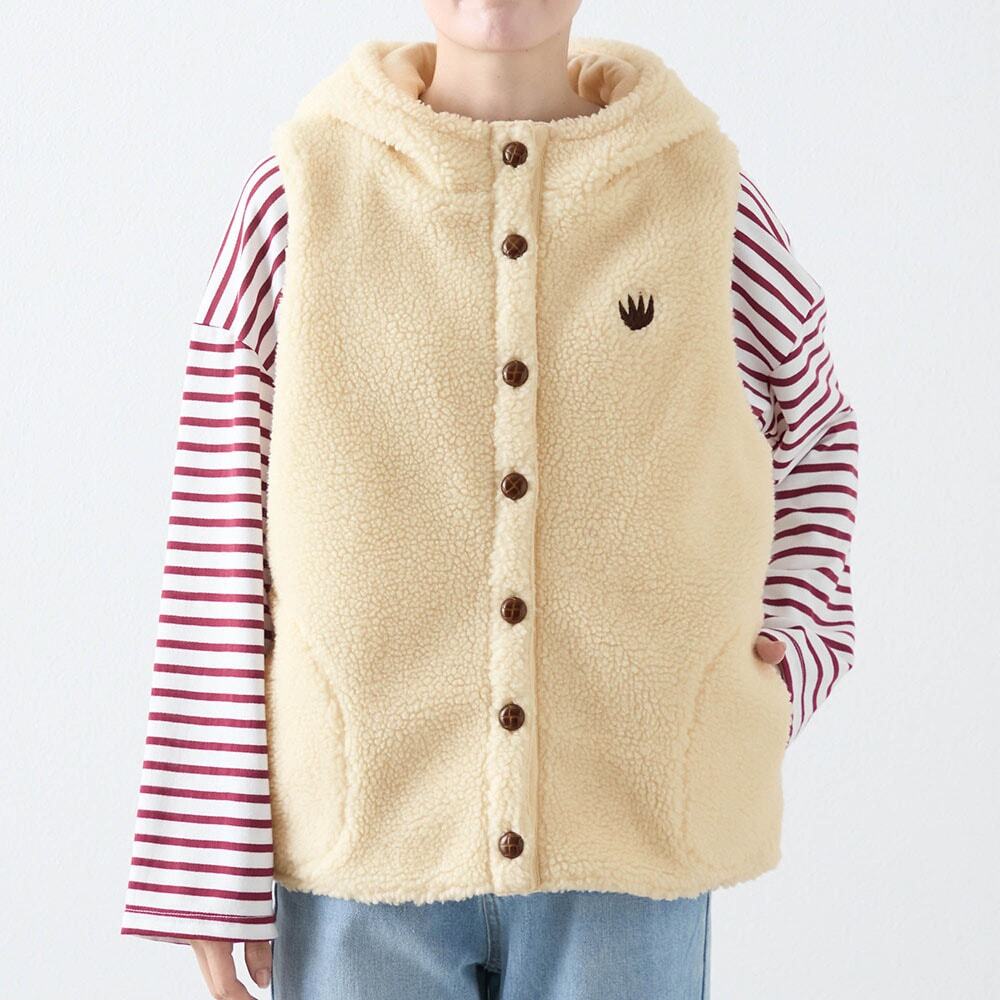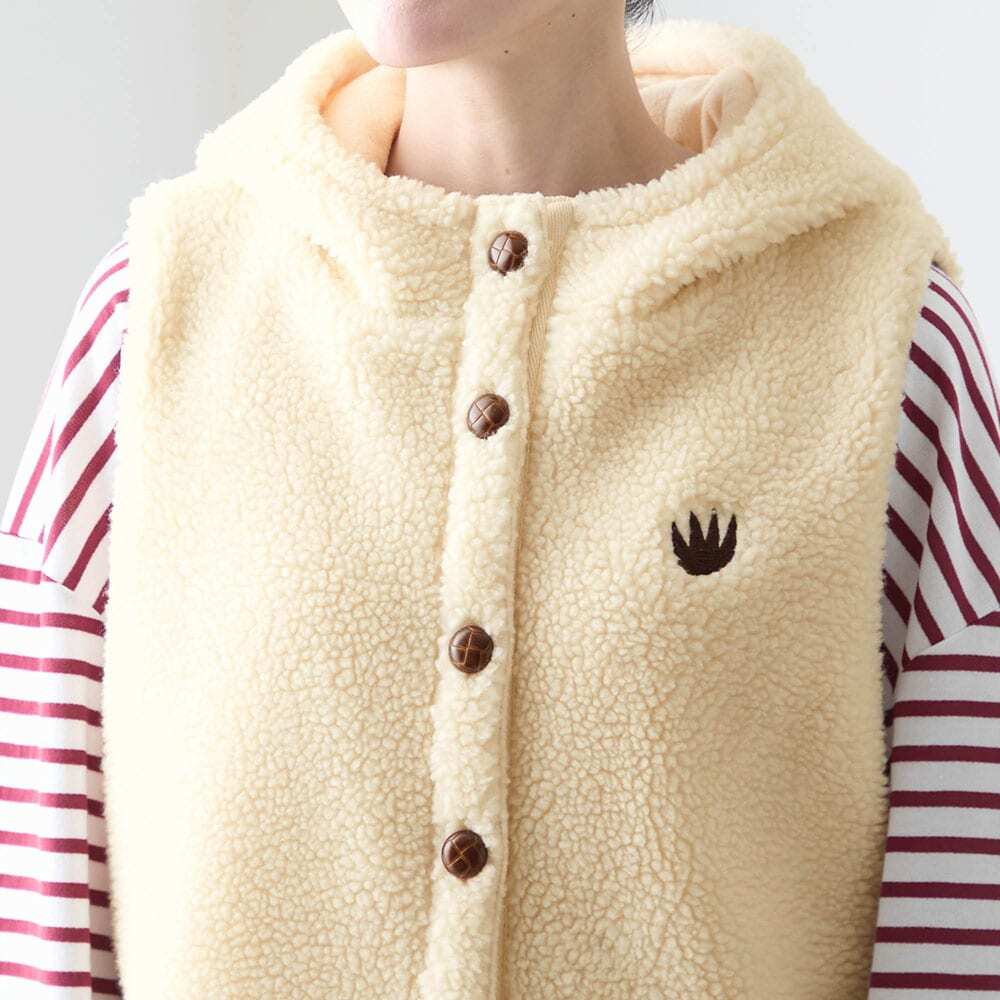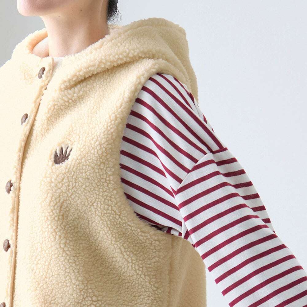 背中の刺繍が可愛い、もこもこ素材とフリースのあったかボアベスト。