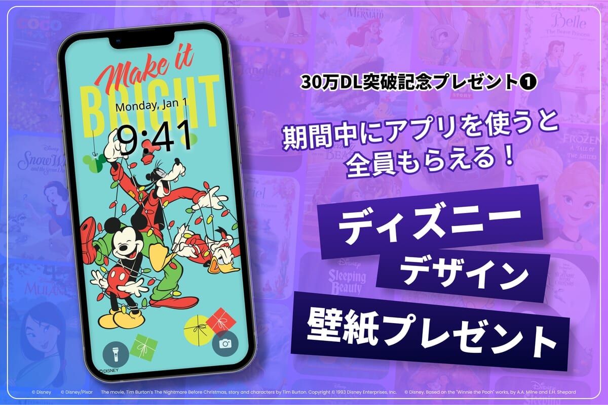 キャンペーン期間中にアプリを利用された全ユーザーに、ディズニーデザインのスマートフォン用壁紙をプレゼント。