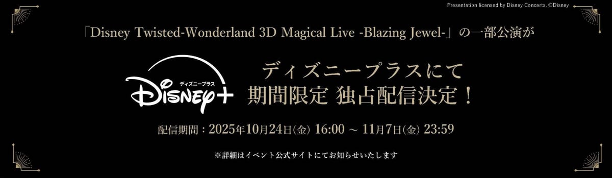 「Disney Twisted-Wonderland 3D Magical Live -Blazing Jewel-」の一部公演が期間限定で「Disney+(ディズニープラス)」にて独占配信されることが決定しました!