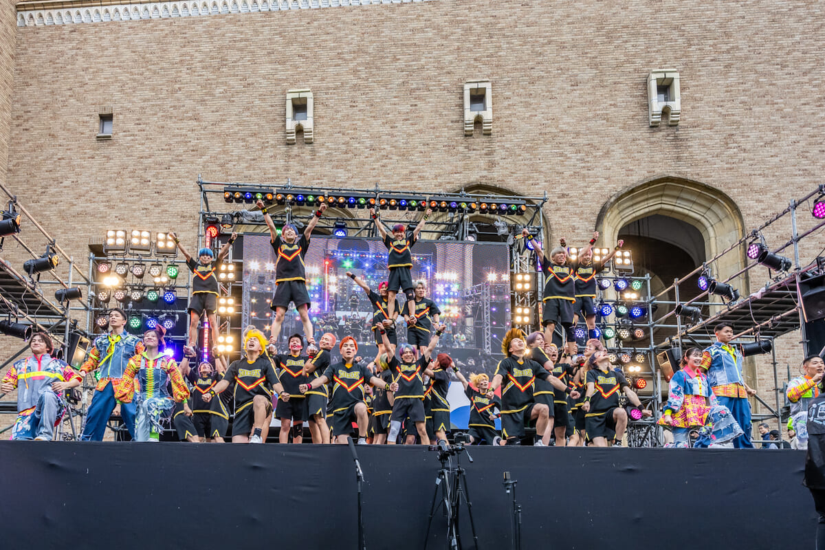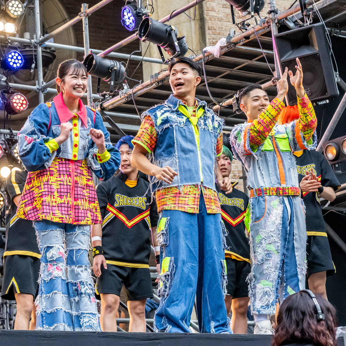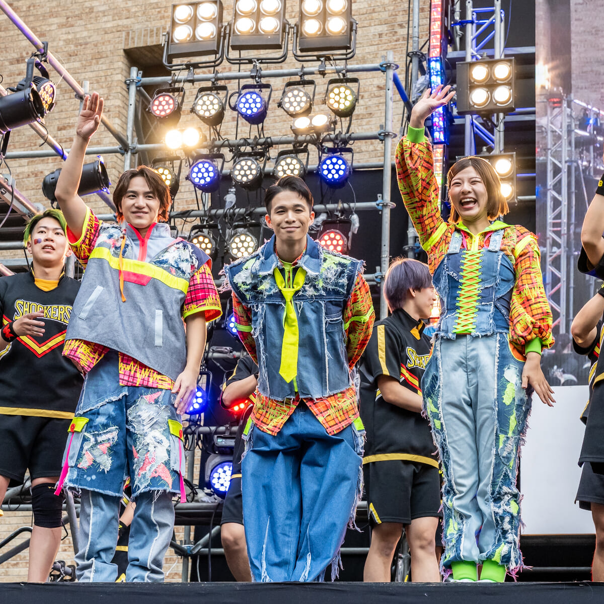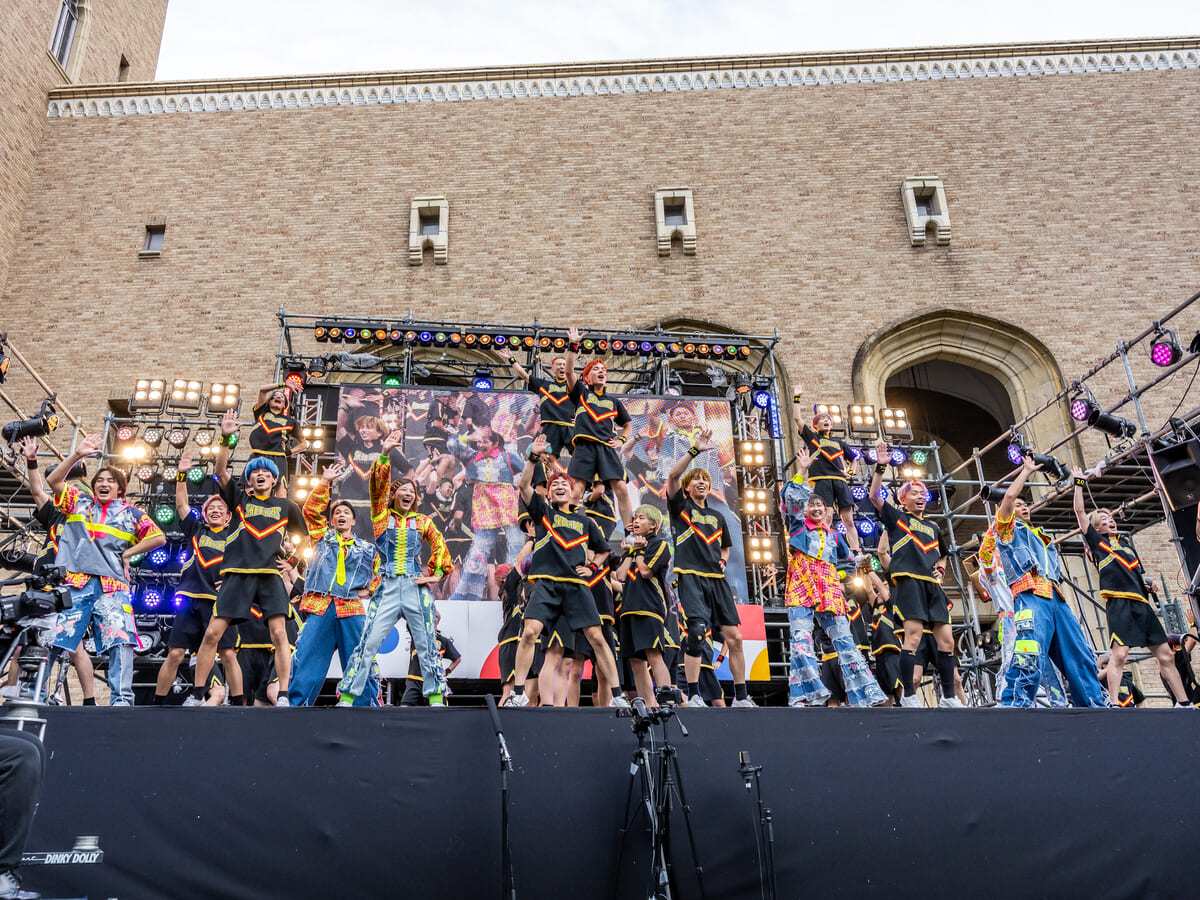 ダンサーたちがステージに登場し、学生たちのパフォーマンスを一緒に熱く盛り上げました。