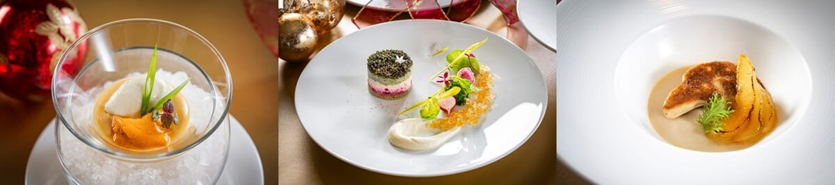 日本料理「木の花」内にある、“大人の隠れ家”鉄板割烹「山吹」では、贅沢な食材をふんだんに使用したクリスマス限定ディナーコースが用意されます。