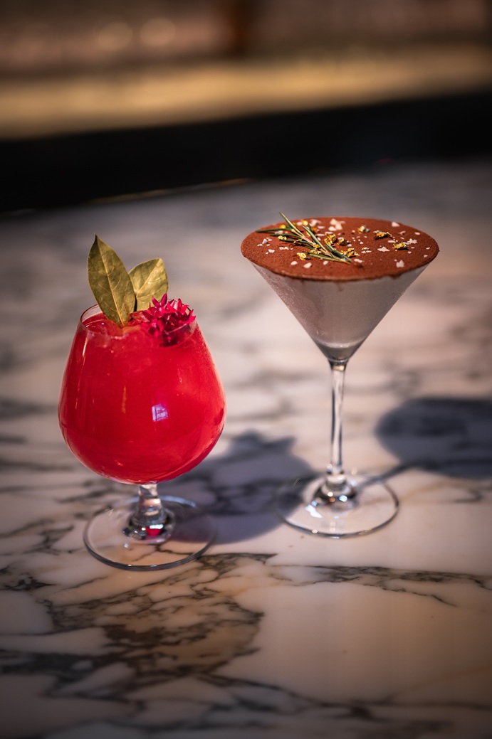 ポインセチアをイメージした赤いカクテルと、デザート感覚で楽しめるスイートな一杯が用意されます。