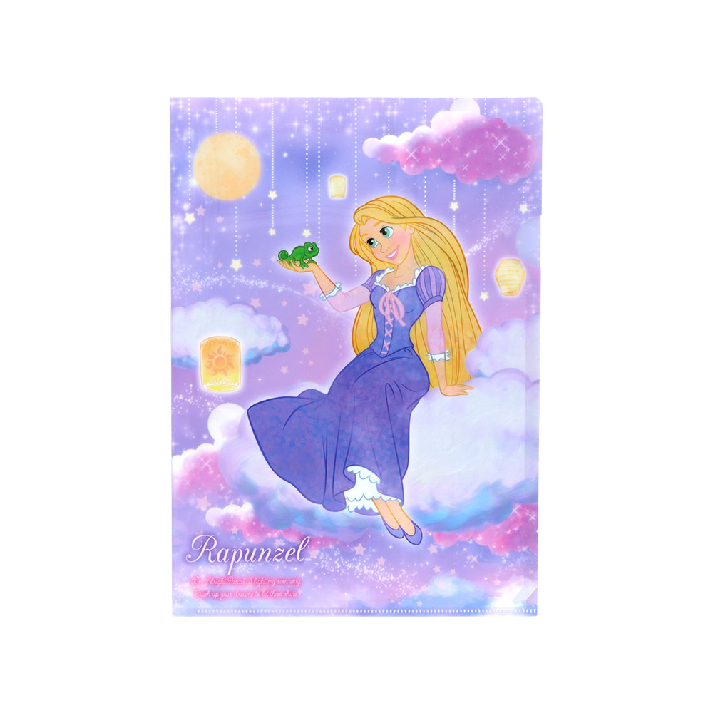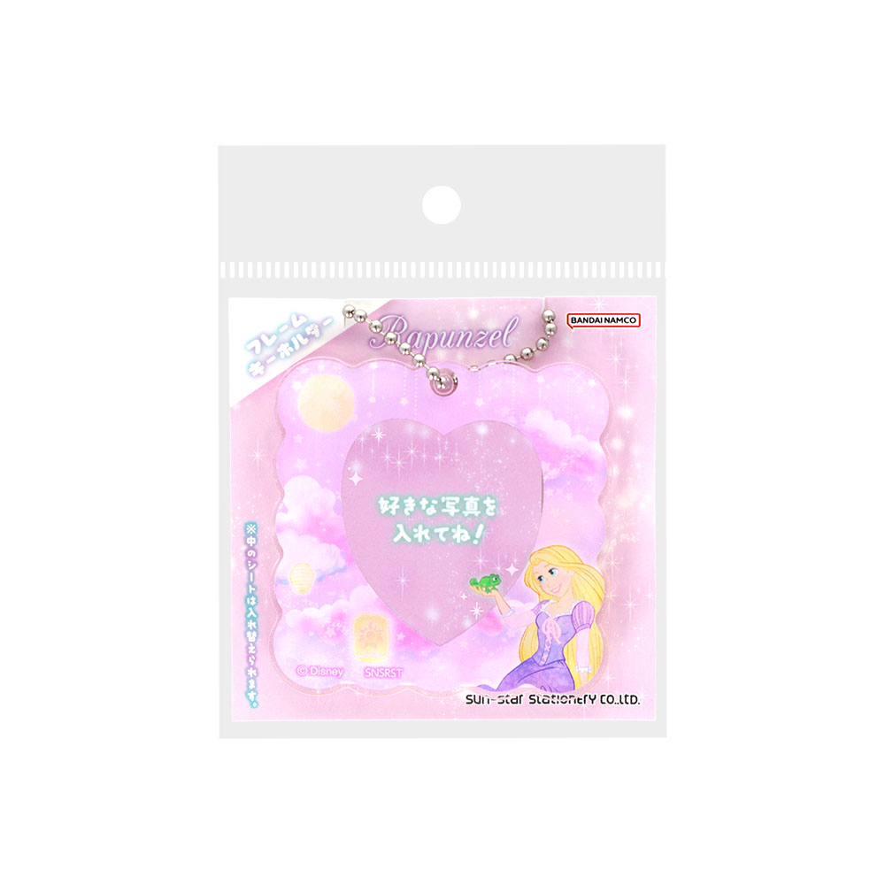 雲が浮かぶピンクやパープルの空と、ディズニープリンセス「ラプンツェル」のフレームキーホルダー。