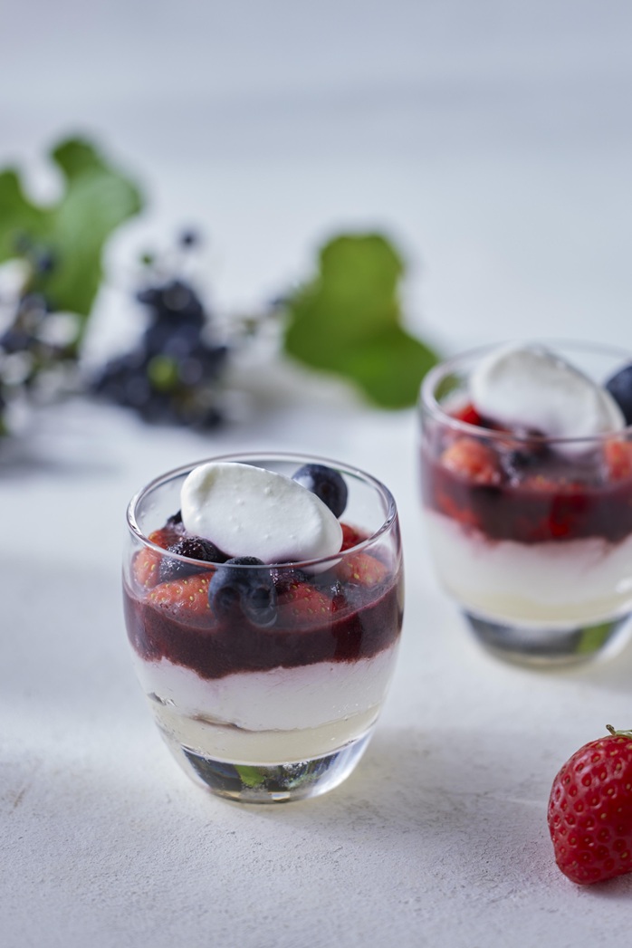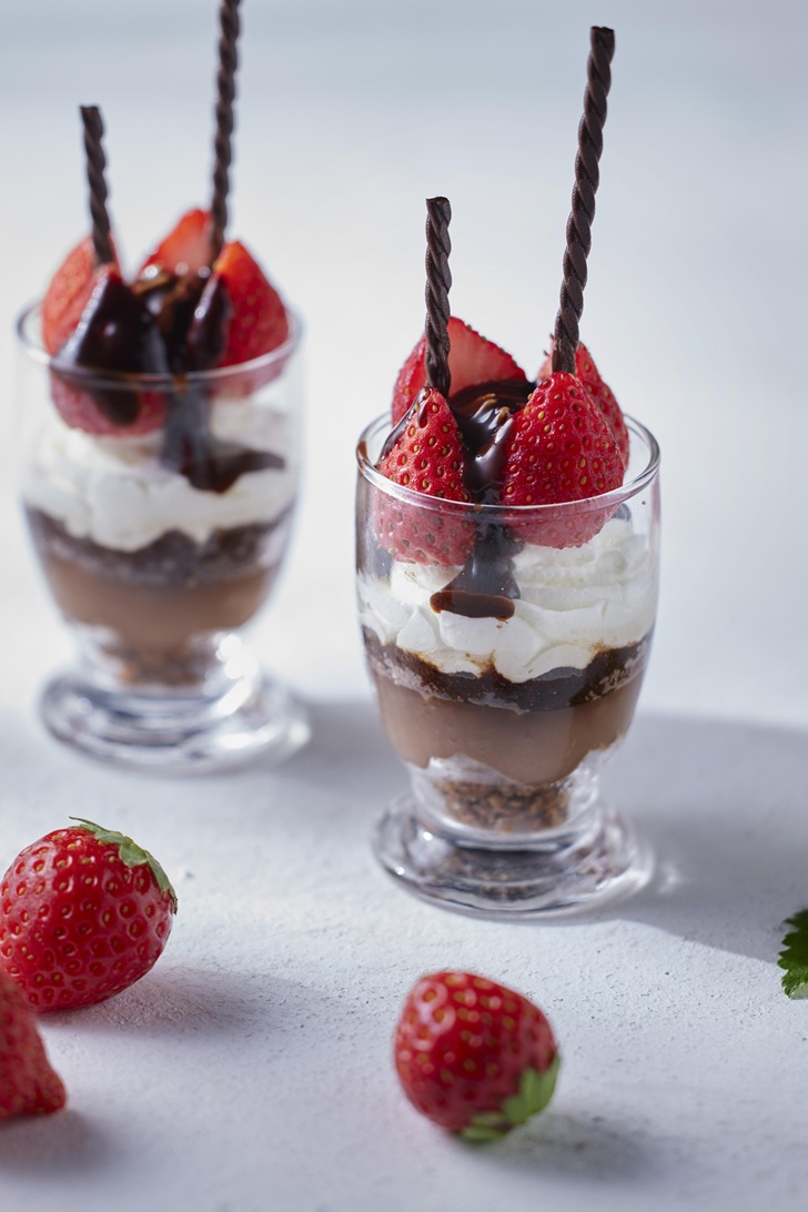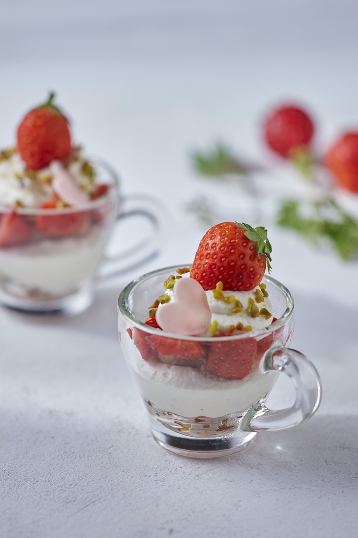 繊細に重ね合わせた素材の層が美しいグラスデザートから、苺そのものの味を楽しむスープ、シンプルな焼き菓子までバラエティ豊かにラインナップ。