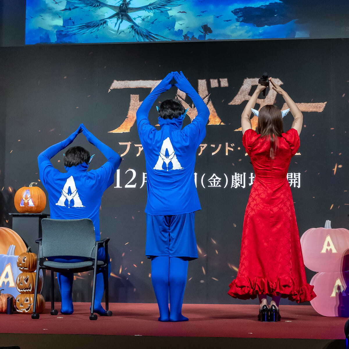 会場には、ナヴィの特殊メイクを施したチョコレートプラネットと、アバターシリーズに登場する新キャラクター・ヴァランの耳をつけた渋谷凪咲さんが登場。