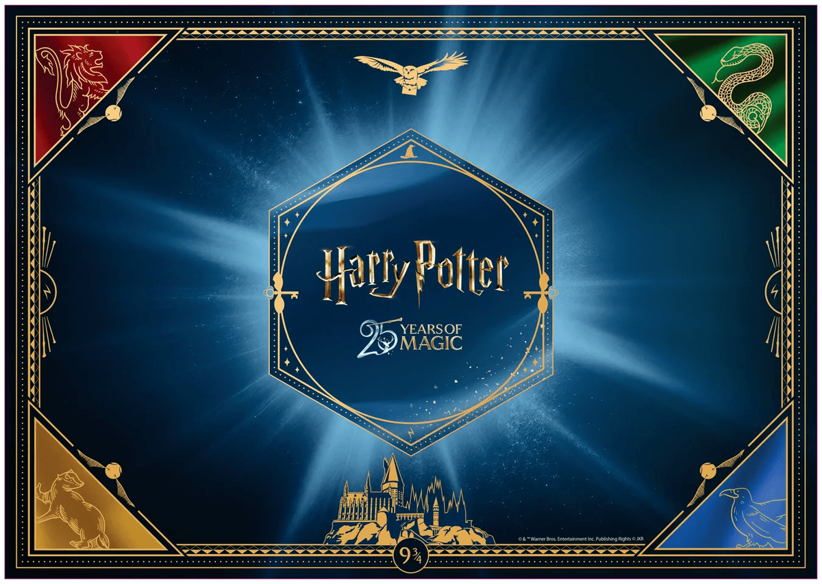 25周年を祝う記念ビジュアルには、4つの寮のモチーフやホグワーツ城、ヘドウィグが描かれ、中央には光り輝く「Harry Potter」と「25 Years of Magic」のロゴが存在感を放っています。