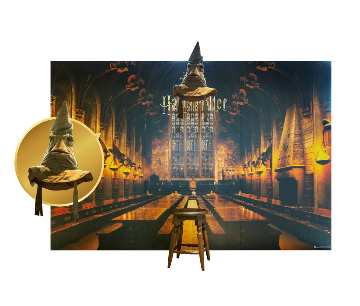 組分け帽子をかぶって、魔法使いの気分を楽しみながら撮影することができます。