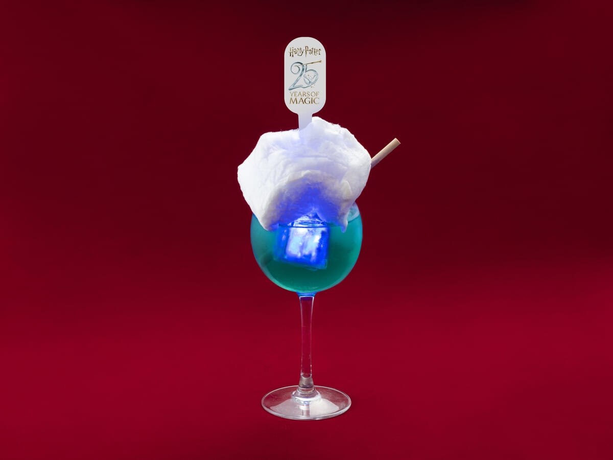 青い液体と綿菓子を組み合わせた、まるで魔法の世界から飛び出してきたようなドリンク。