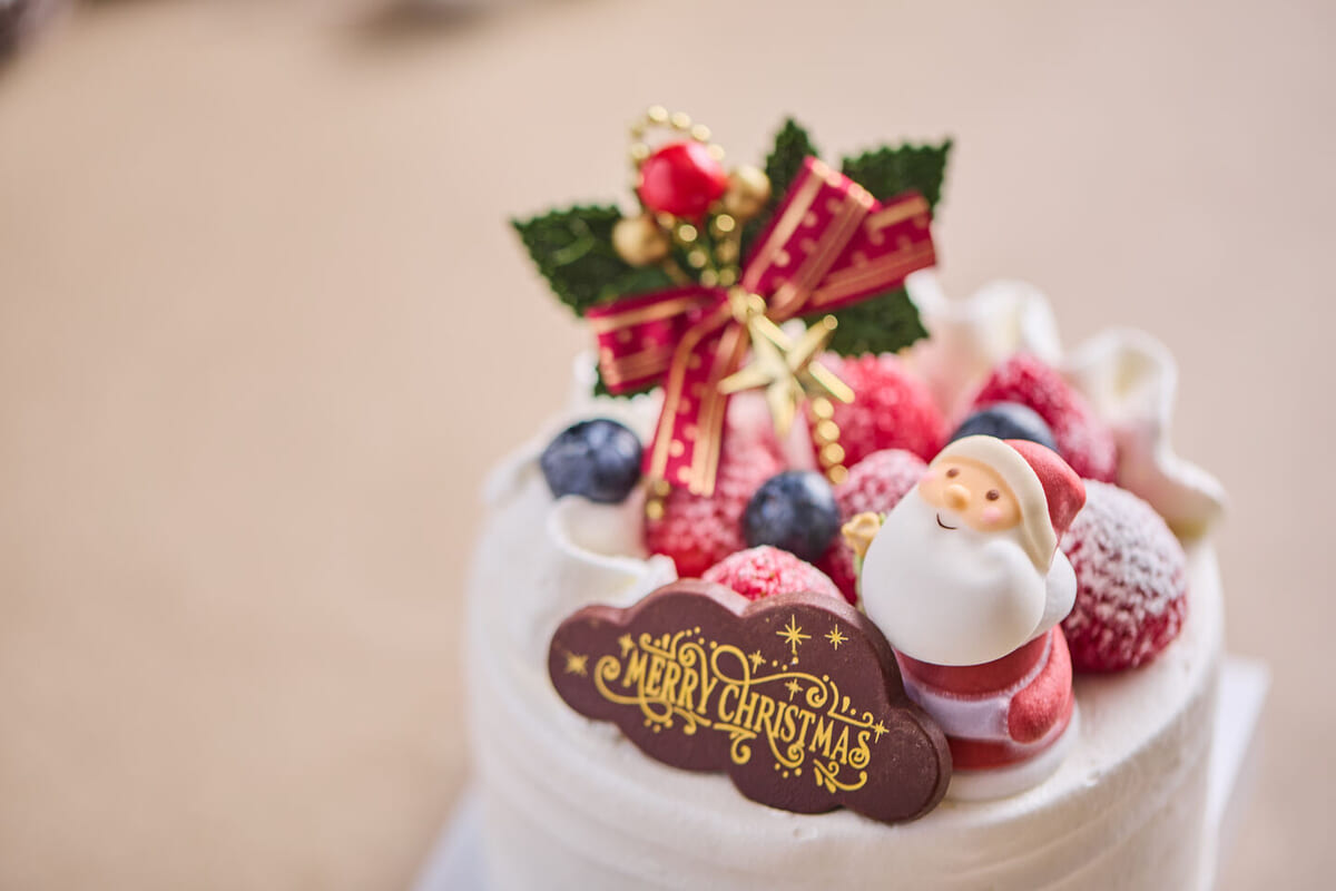 真っ白な雪のようなデコレーションに、鮮やかな赤い苺とリボンが映える、まさにクリスマスにふさわしい華やかさ。