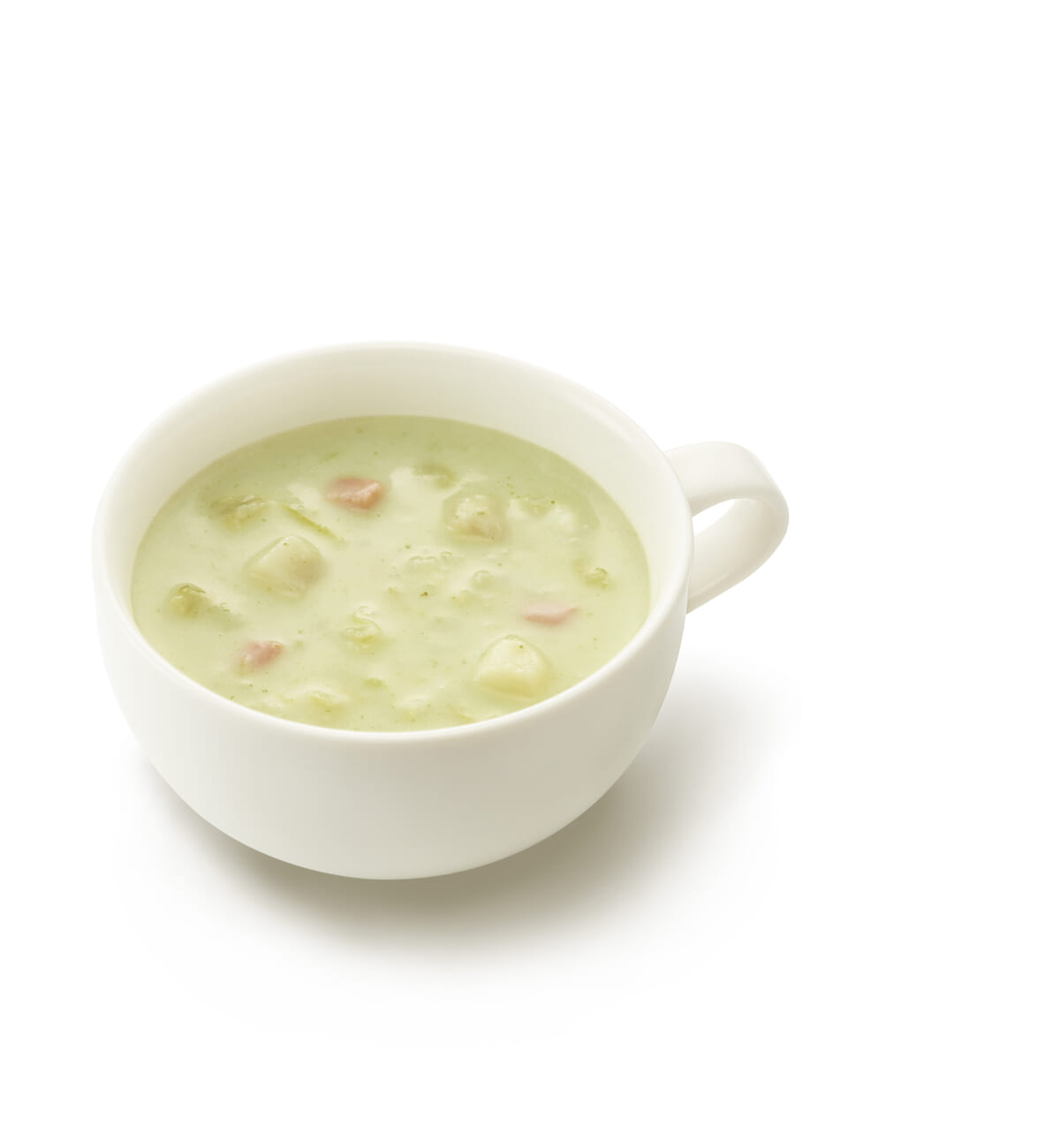 「ブロッコリーとじゃがいものポタージュ」は、そんな国産ブロッコリーの茎にじゃがいもや玉ねぎ、セロリ、ほうれん草、ショルダーベーコンを合わせてポタージュにした具沢山なスープ。