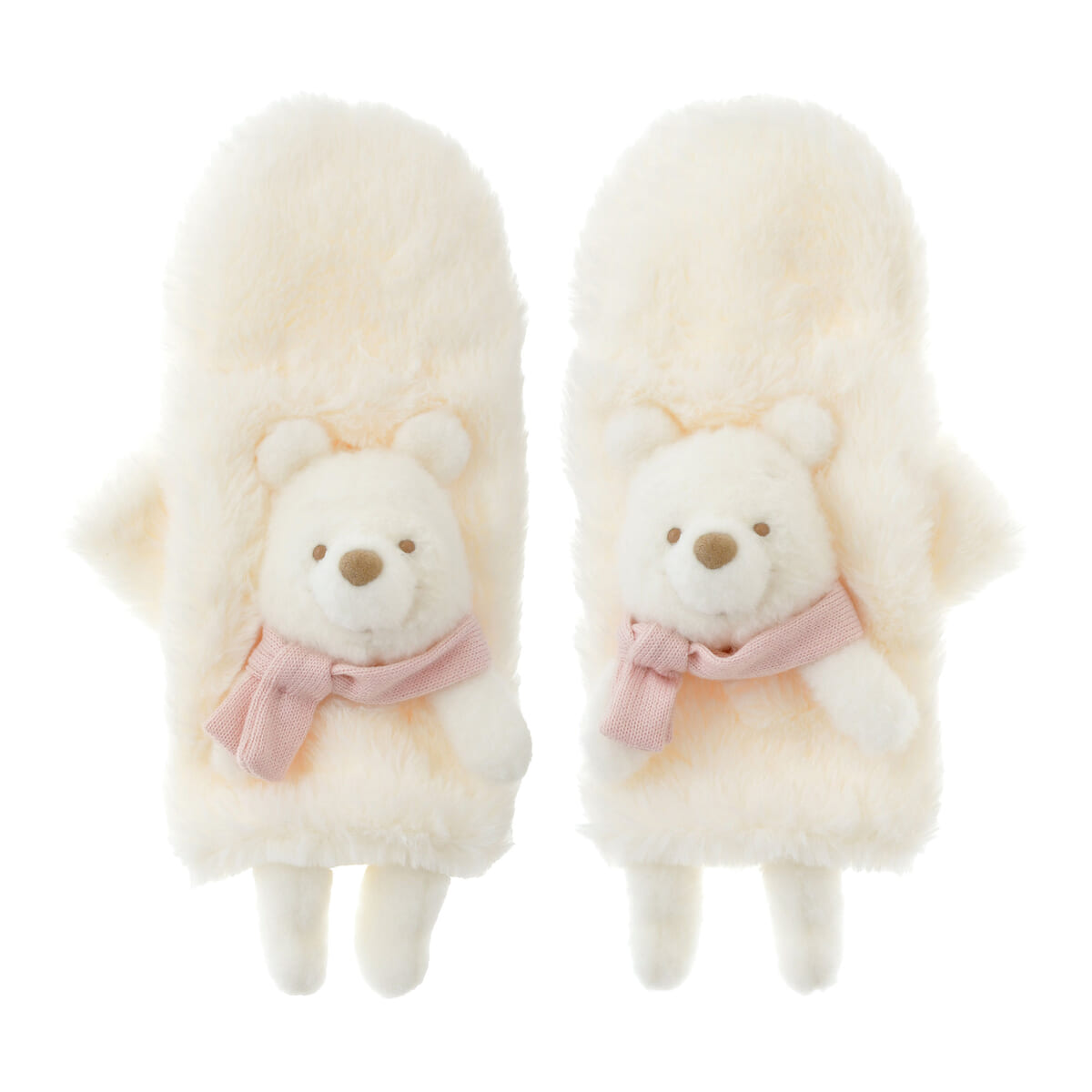 雪が積もって白くなった「くまのプーさん」モチーフを羊毛風素材で再現した手袋。