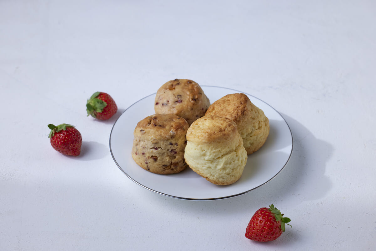 焼きたてスコーンは、プレーンと苺&アプリコットの2種類をラインナップ。