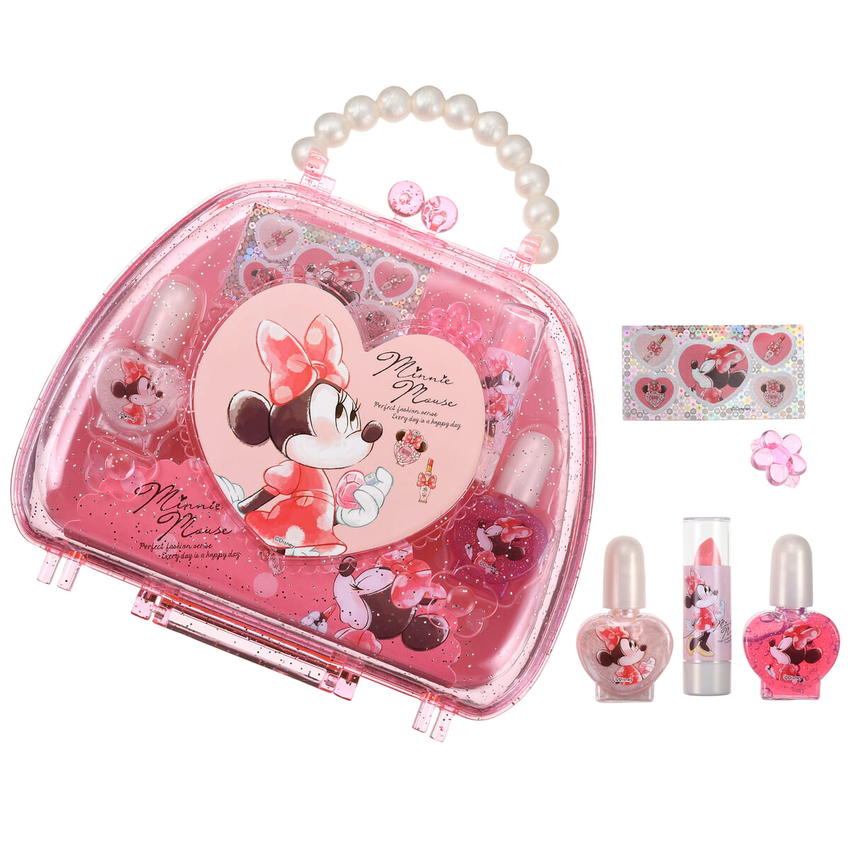 パール風ビーズハンドルがおしゃれなハンドバッグ型ケースに入った「ミニーマウス」のコスメセット。