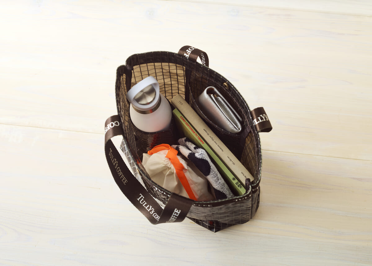 トートバッグはクリアなブラウンカラーで、素材や内側にはポケットやタンブラーホルダーなど機能性にこだわったデザイン。