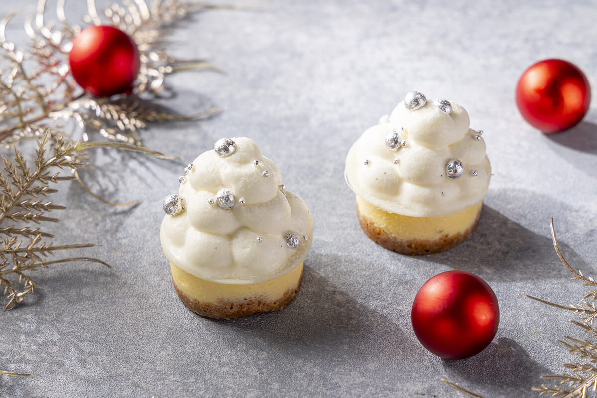 ベイクドチーズケーキにマスカルポーネチーズクリームをふんわりと絞り、ツリーのような装いにした「ツリーフロマージュ」