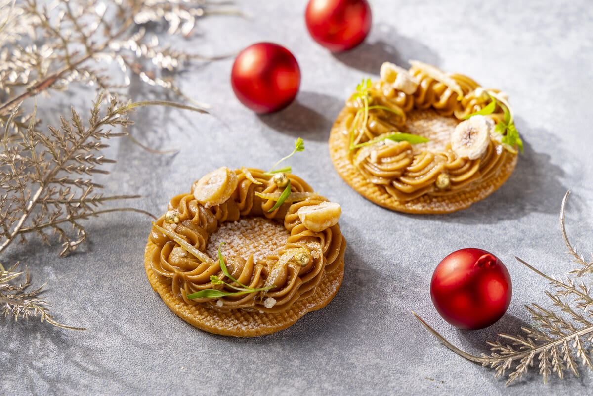 クリスマスリースをモチーフに、リング状のサブレにヘーゼルナッツプラリネ入りのバタークリームをった「クロンヌプラリネ」