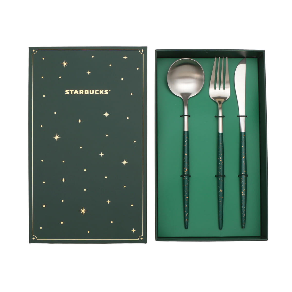 スプーン・フォーク・ナイフの3本を、特別感のあるゴールドデザインのボックスに収めています。