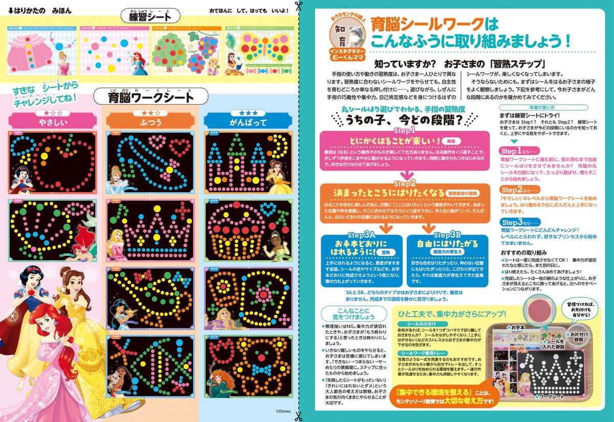 今回、そんなモンテッソーリ教育を手軽に楽しめる『頭がよくなる! おうち モンテッソーリ 育脳シールワーク ディズニープリンセス』が講談社より登場。