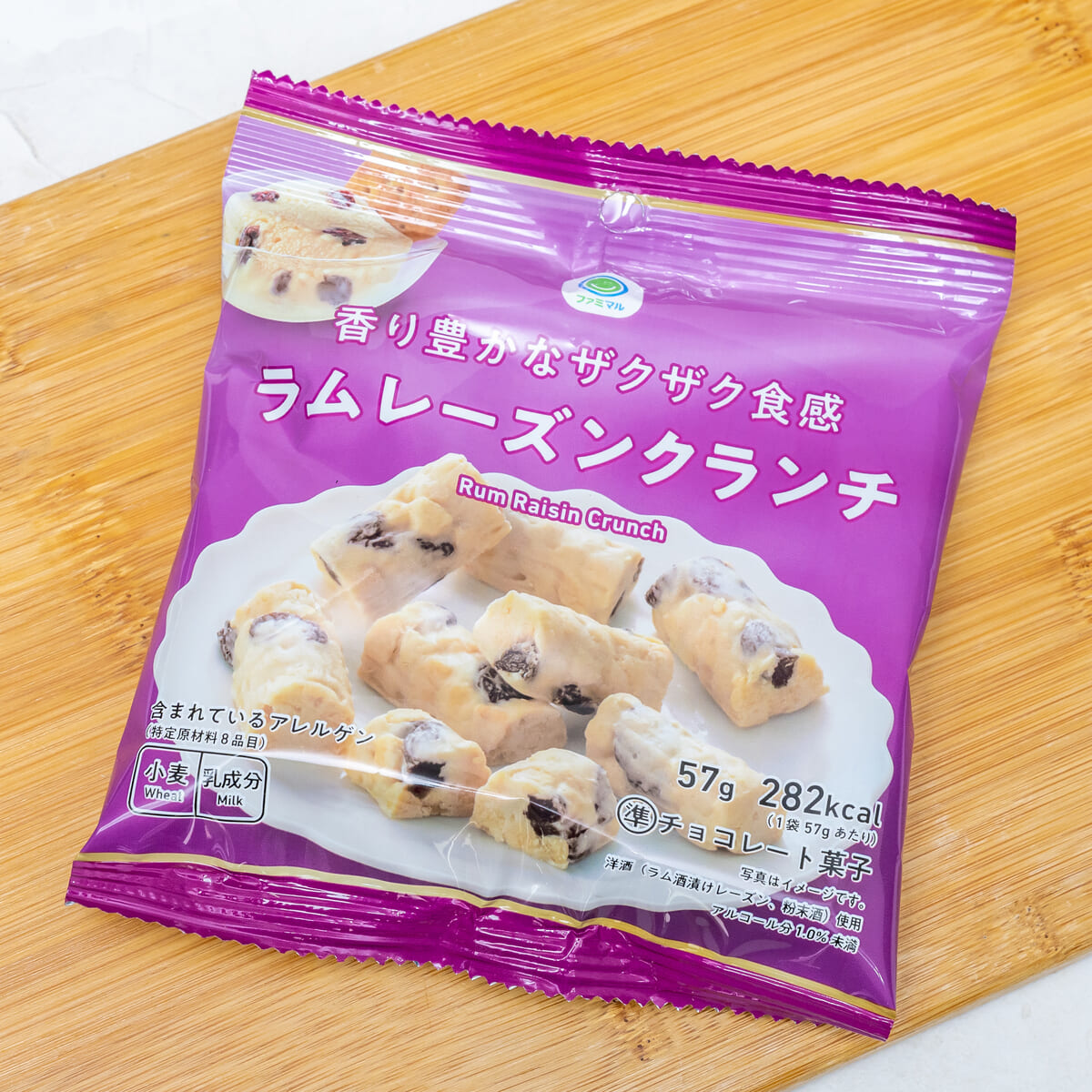 ラムレーズンとホワイトクッキーをラム酒の入ったホワイトチョコで固めた「ラムレーズンクランチ」