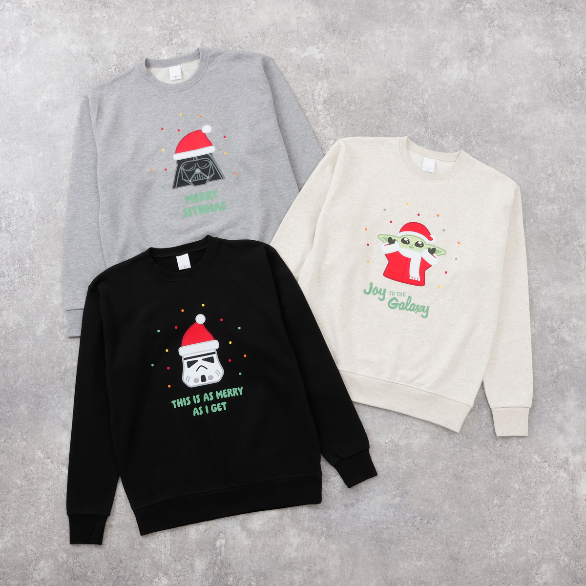 「スター・ウォーズ」のクリスマス柄スウェットは、サンタの帽子をかぶった「スター・ウォーズ」のキャラクターがポイント。