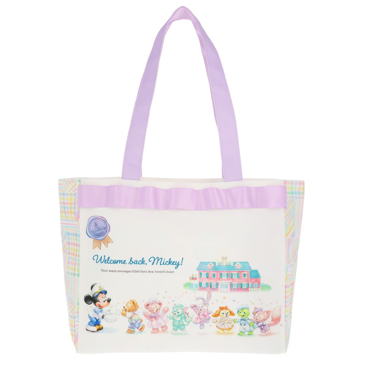 ミッキーとダッフィー&フレンズの心温まるアートが描かれたトートバッグ。
