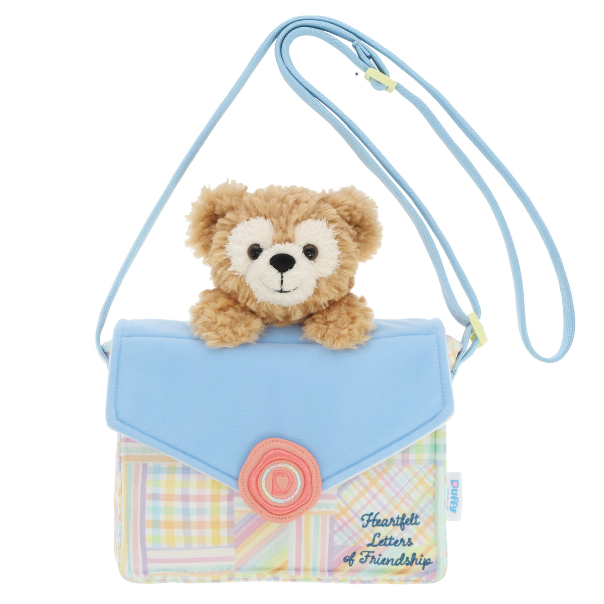 手紙のようなデザインのポケットからダッフィーが顔を出しているショルダーバッグ。