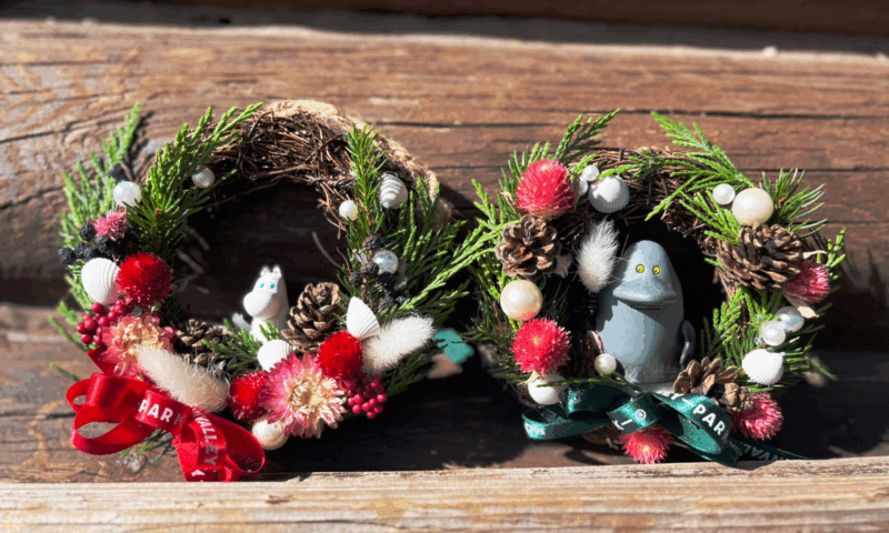 パーク内で咲いてるお花のドライや木の実、お気に入りのキャラクターフィギュアを飾り付けて自分だけのオリジナルミニリースを制作できます。
