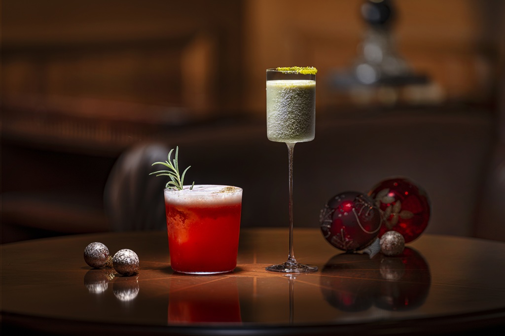 バー「ベイ・ウエスト」では、クリスマス気分を盛り上げる期間限定カクテル「Noël Pistachio Hopper」と「Strawberry Christmas Fizz」の2種類を販売中。