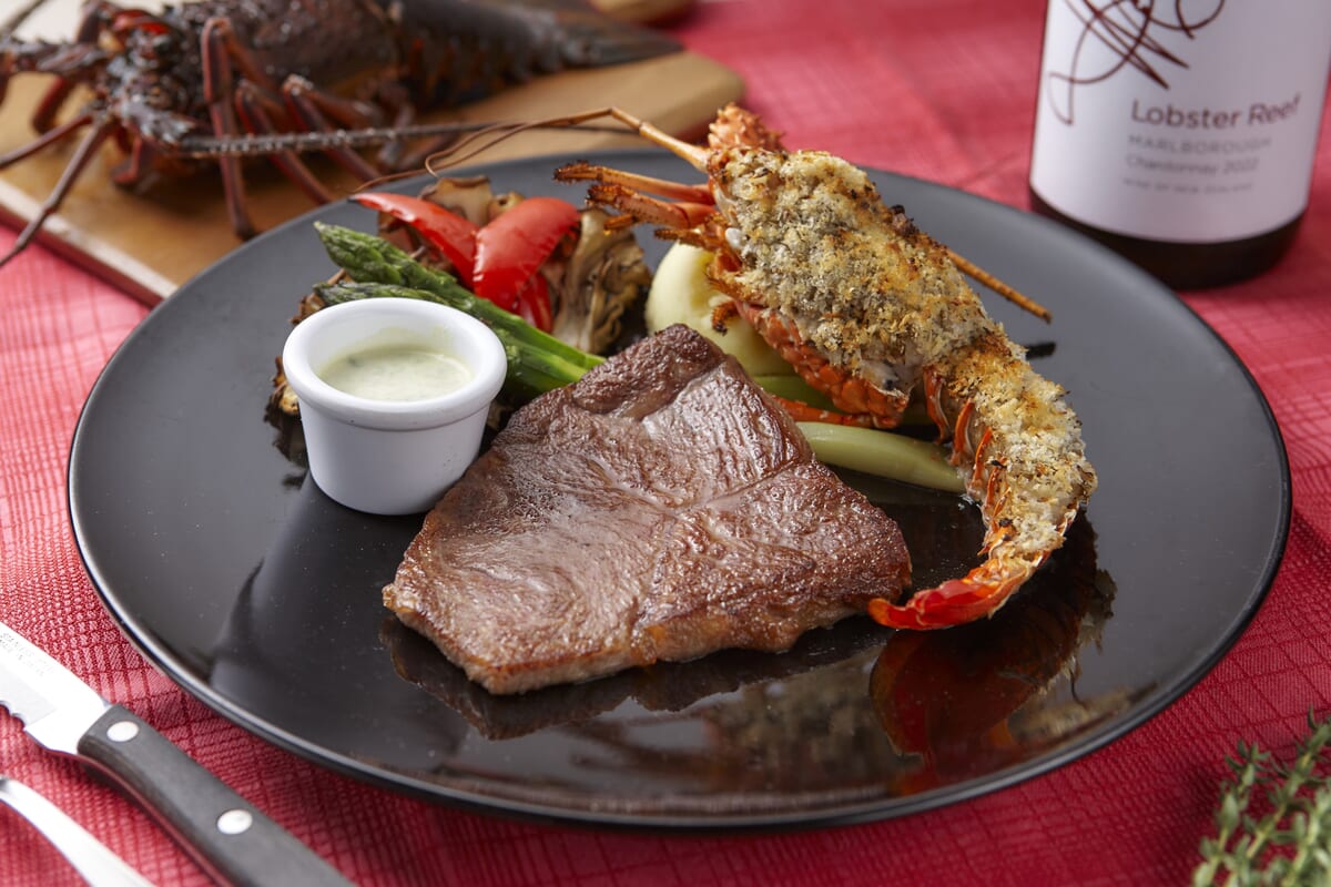 香ばしくソテーした舞茸と玉ねぎを伊勢海老の身と合わせ、殻に詰めてパン粉を乗せ焼き上げた「ふらの和牛サーロインステーキ&伊勢海老と舞茸のファルシ」