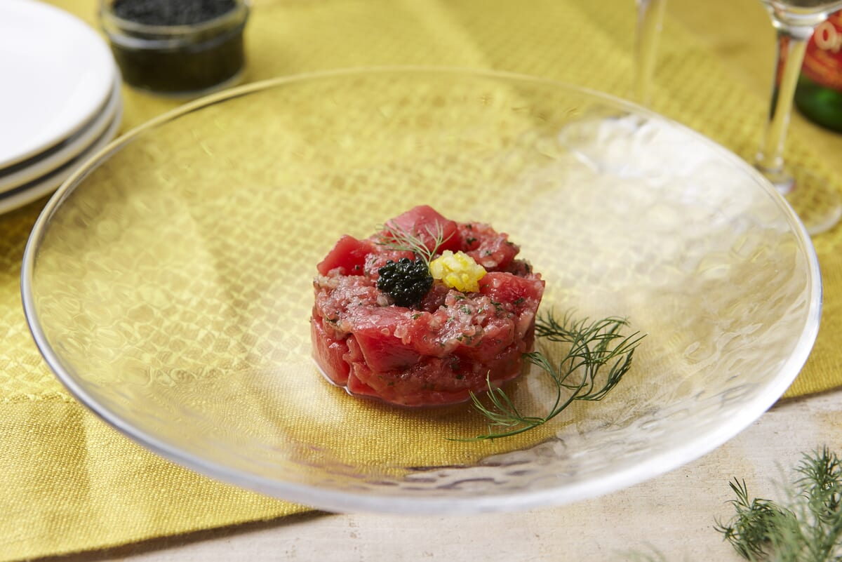 たっぷりのクロマグロを使い、玉ねぎと共にアンチョビとオリーブオイルで和えた「国産本鮪の冷製タルタル~キャビアと柚子の香り~」