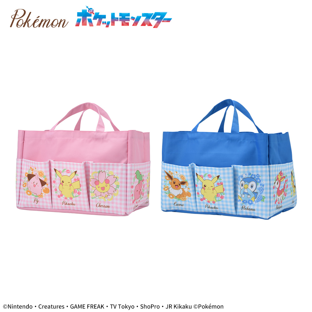 ポケモンたちがプリントされた、ポケット付きの収納バッグ。