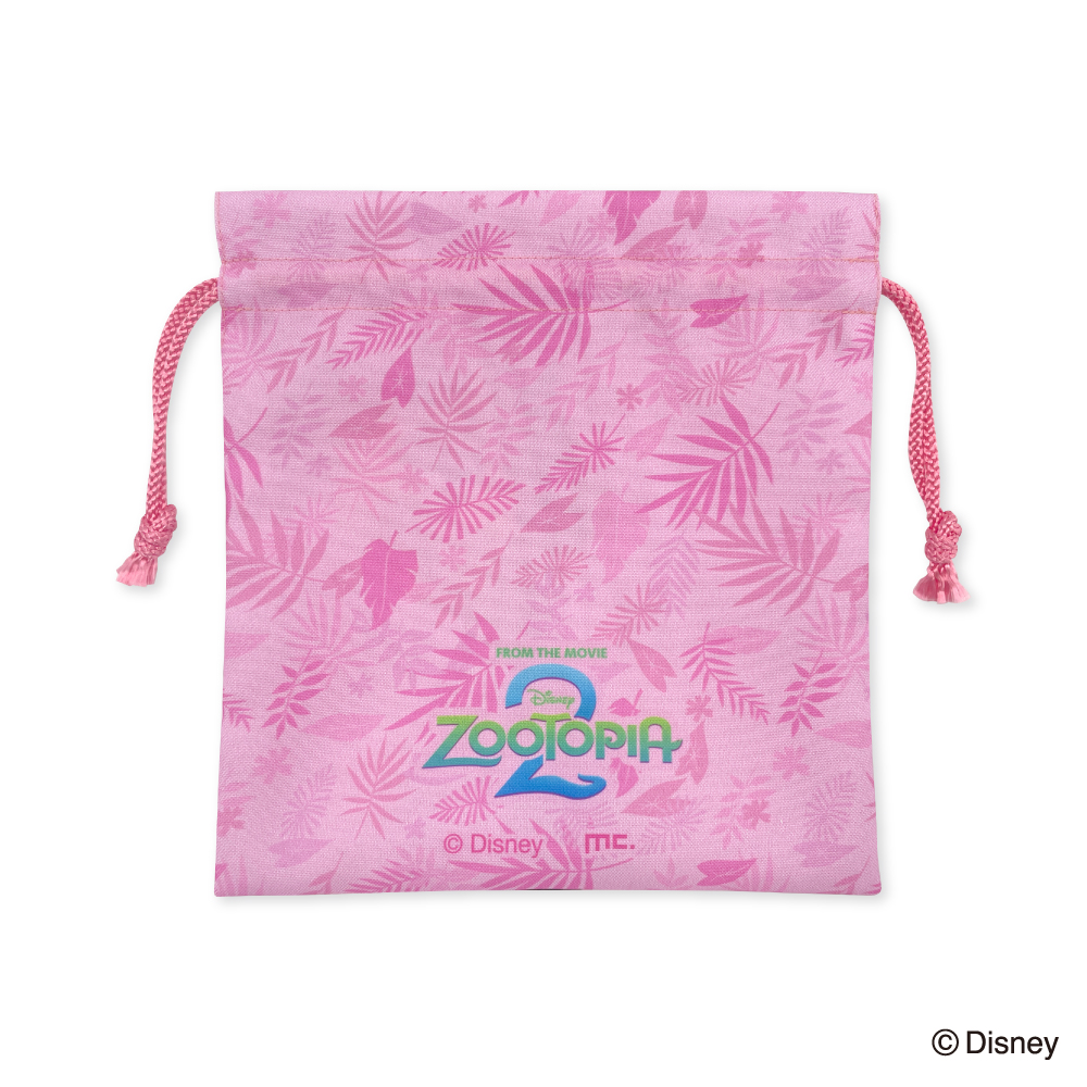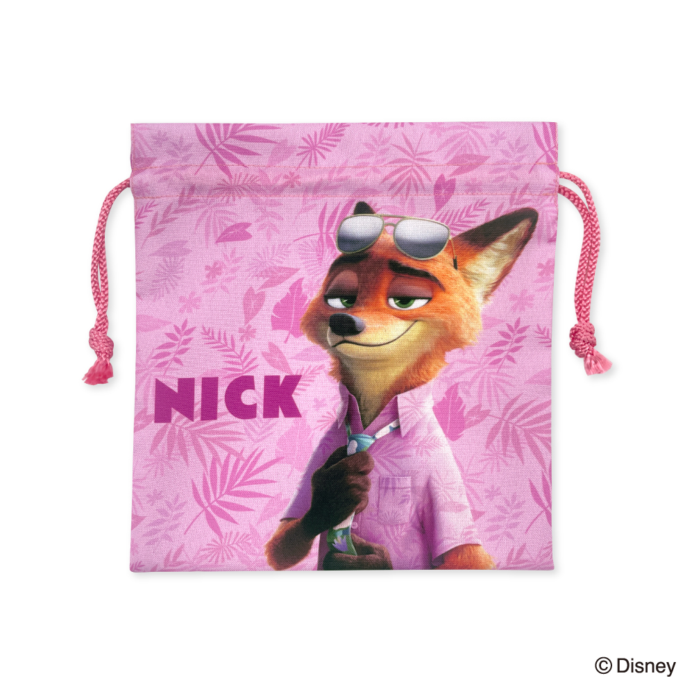 「ニック・ワイルド」の3Dアートをあしらった巾着は、南国風模様のピンク色です☆