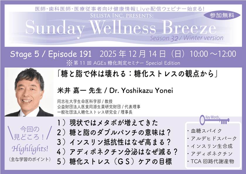 セリスタ株式会社は、医師・歯科医師などの医療従事者を対象とした無料Zoomオンラインセミナー「Sunday Wellness Breeze Season 32 Stage 5」を2025年12月14日(日)に開催。