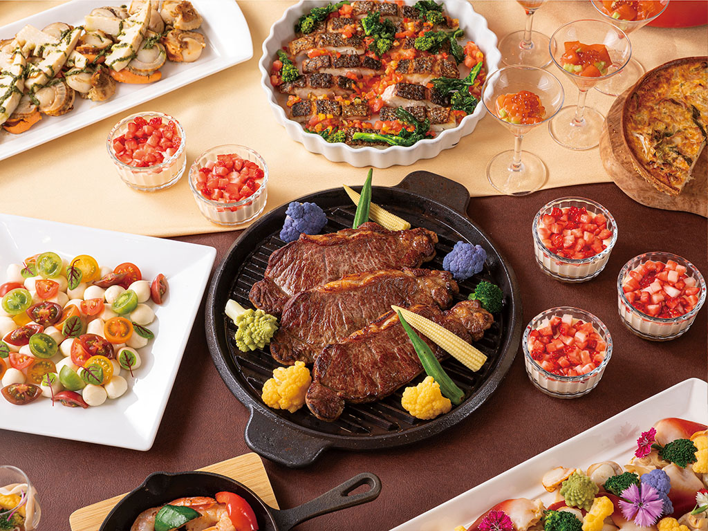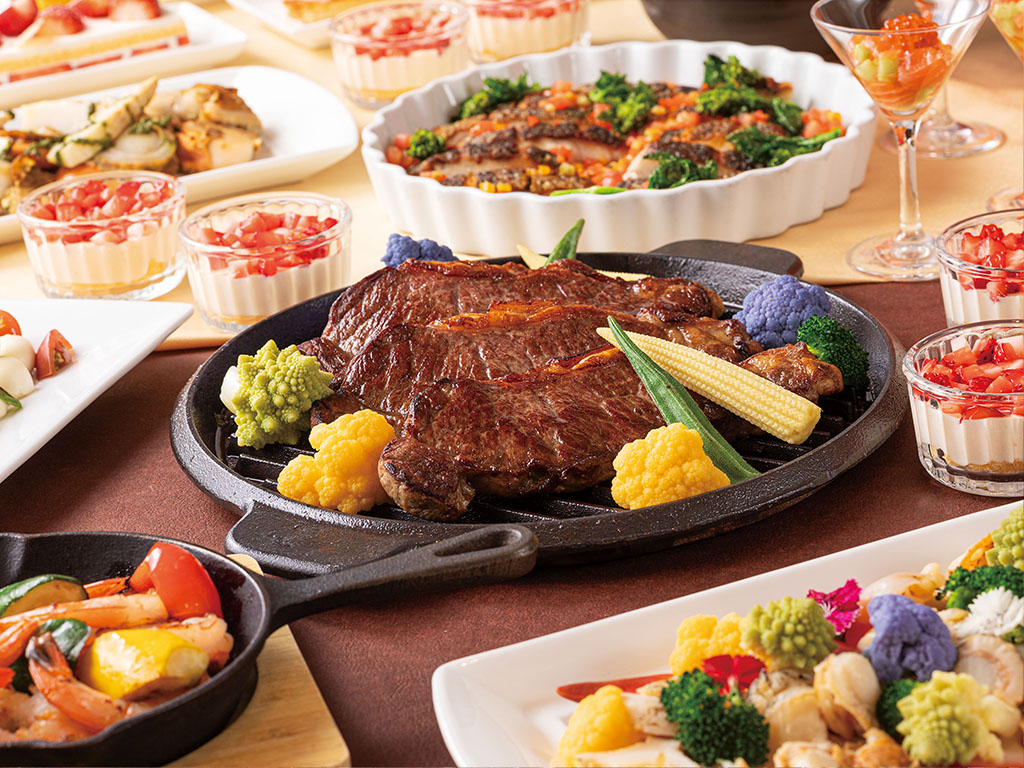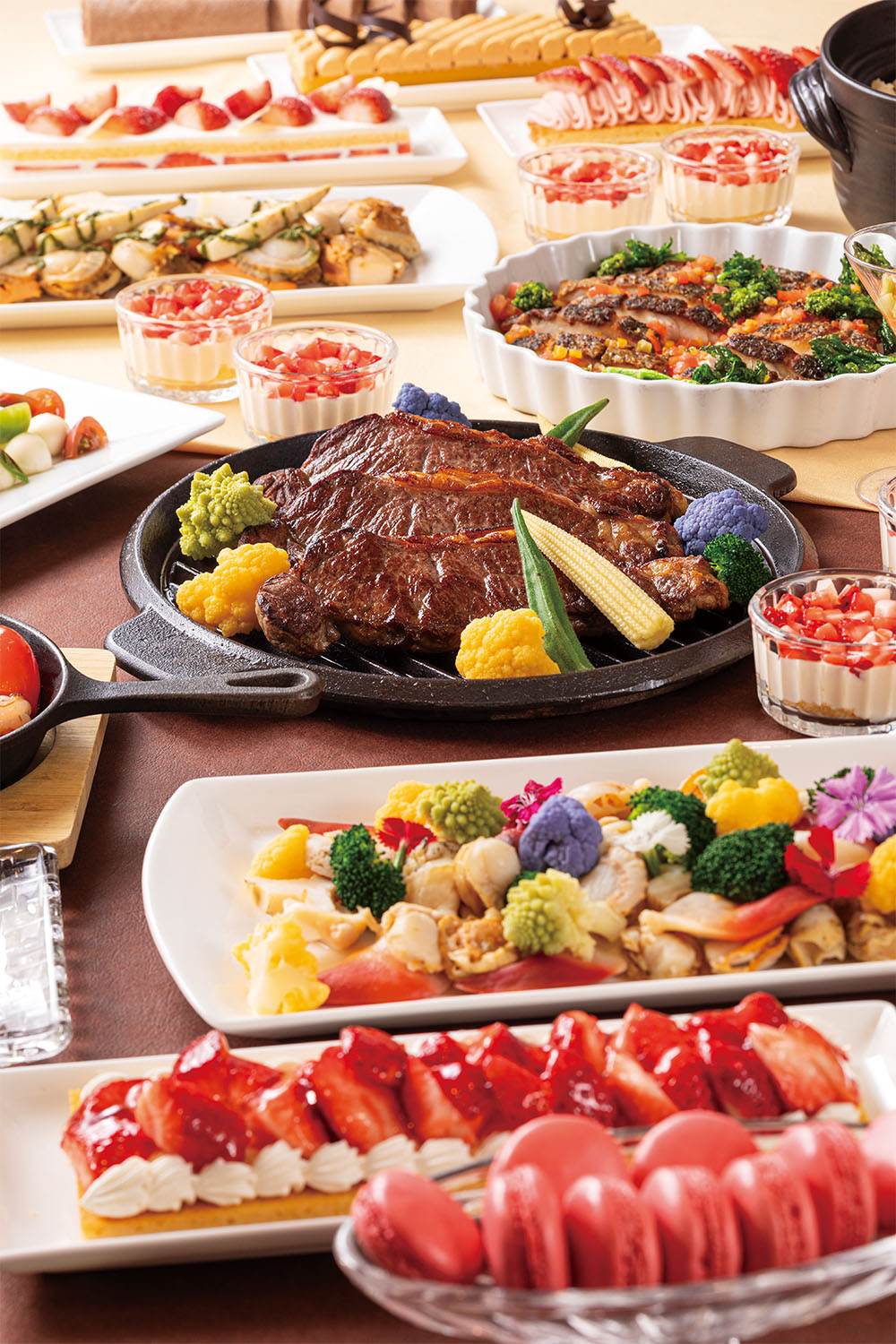 ライブキッチンで焼き上げるサーロインステーキ食べ放題&甘酸っぱい苺スイーツを楽しむディナービュッフェ。