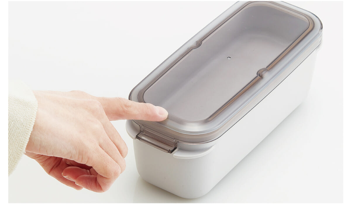 フタは押すだけでロックでき、開ける時は両手でつまんでスムーズにオープン。