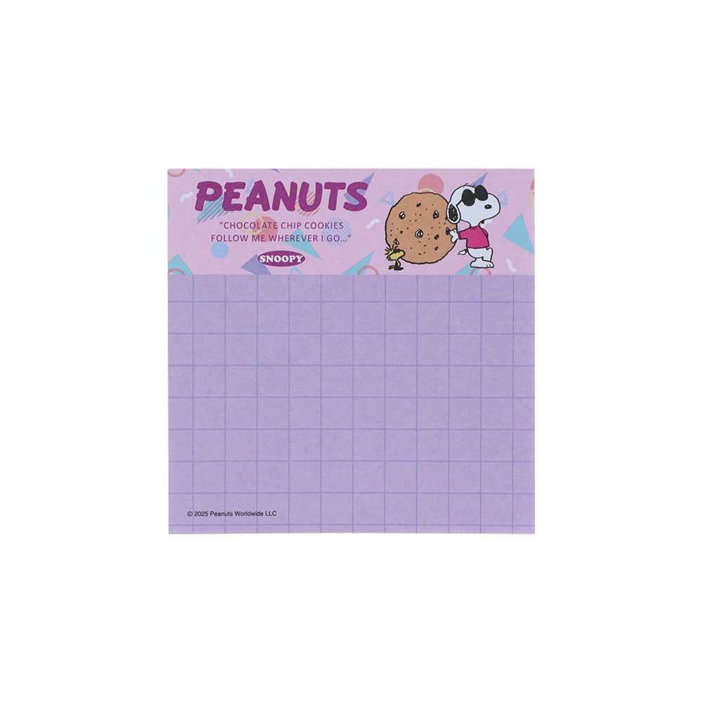 メモには大きなチョコチップクッキーに手をかけポーズをきめる「ジョー・クール」と「ウッドストック」が描かれています。