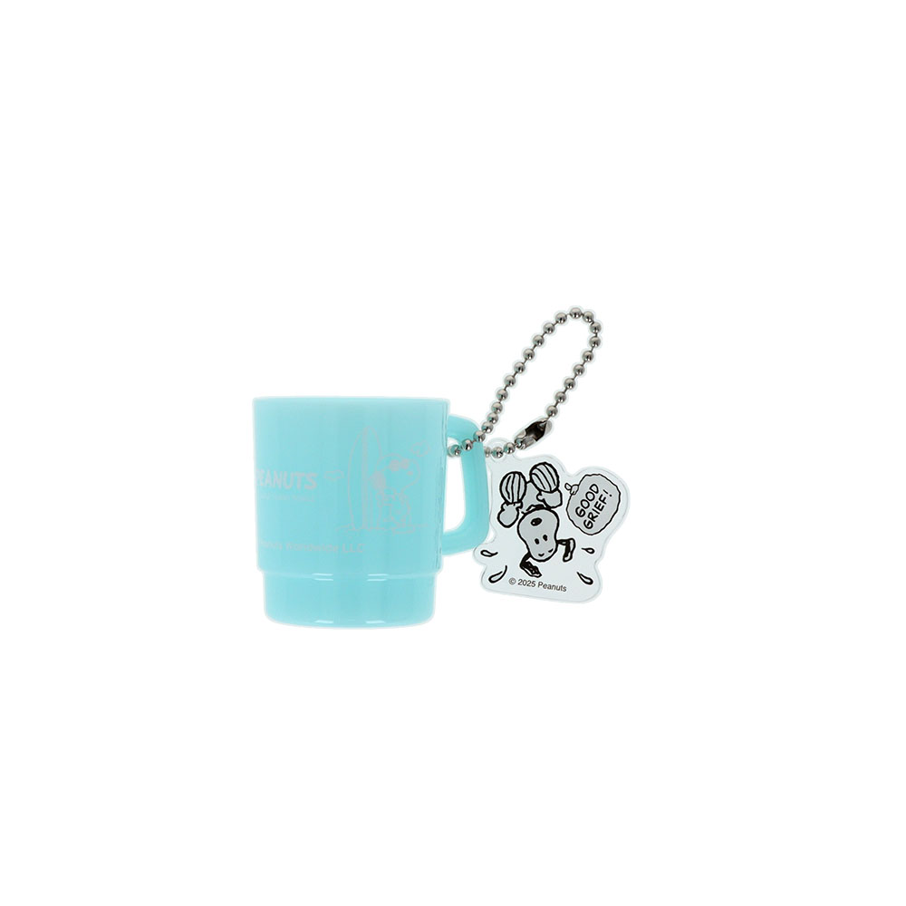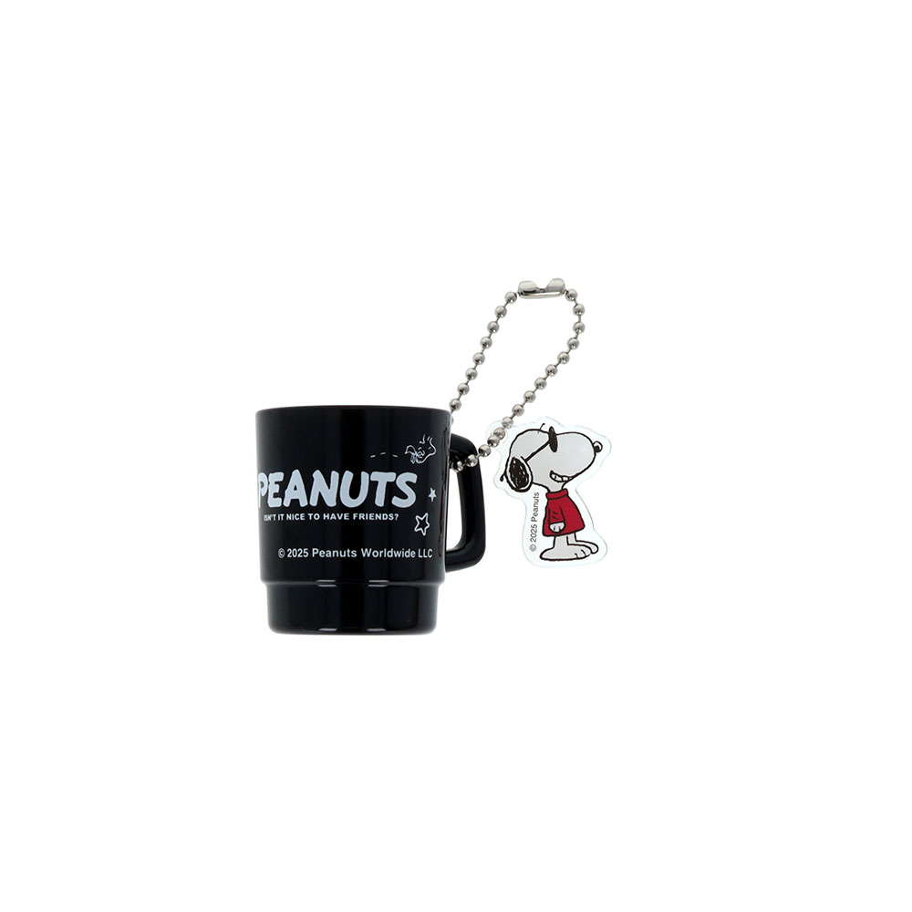 「ジョー・クール」をデザインしたカップに逆さまになった「スヌーピー」を描いたチャーム、
