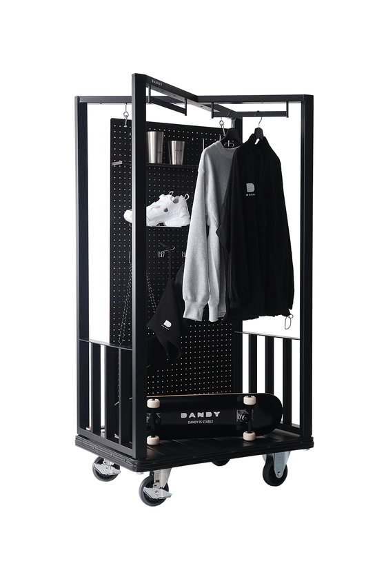 クロス部分にハンガーオプションを取り付けることで、衣類やアイテムを吊り下げるディスプレイラックとして活用が可能。
