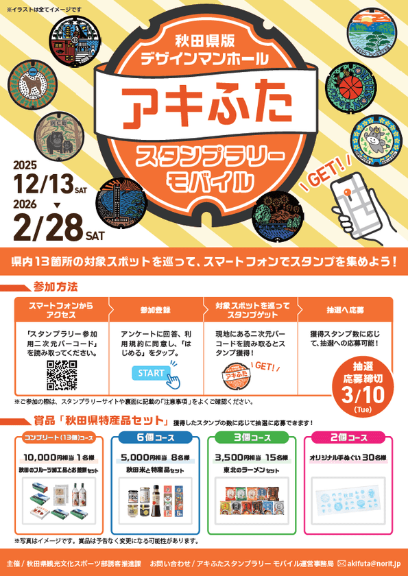 秋田県内のデザインマンホール(通称「アキふた」)を巡り、スマートフォンでスタンプを集めることで特産品セットなどの抽選に参加できるイベントです。