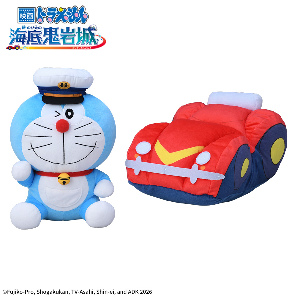 『映画ドラえもん 新・のび太の海底鬼岩城』から「ドラえもん」と「水中バギー」の大きなサイズのぬいぐるみが登場。