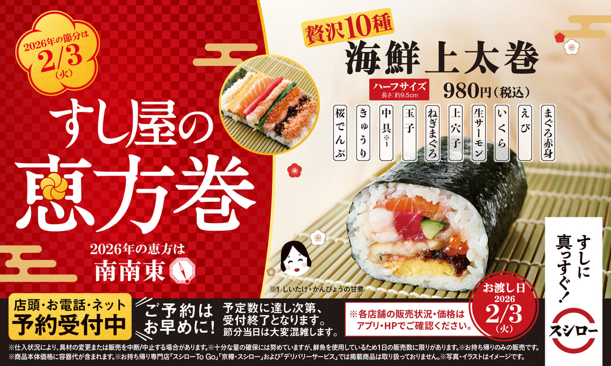 回転寿司チェーン「スシロー」が、2026年節分用「すし屋の恵方巻」各種の予約受付を開始!
