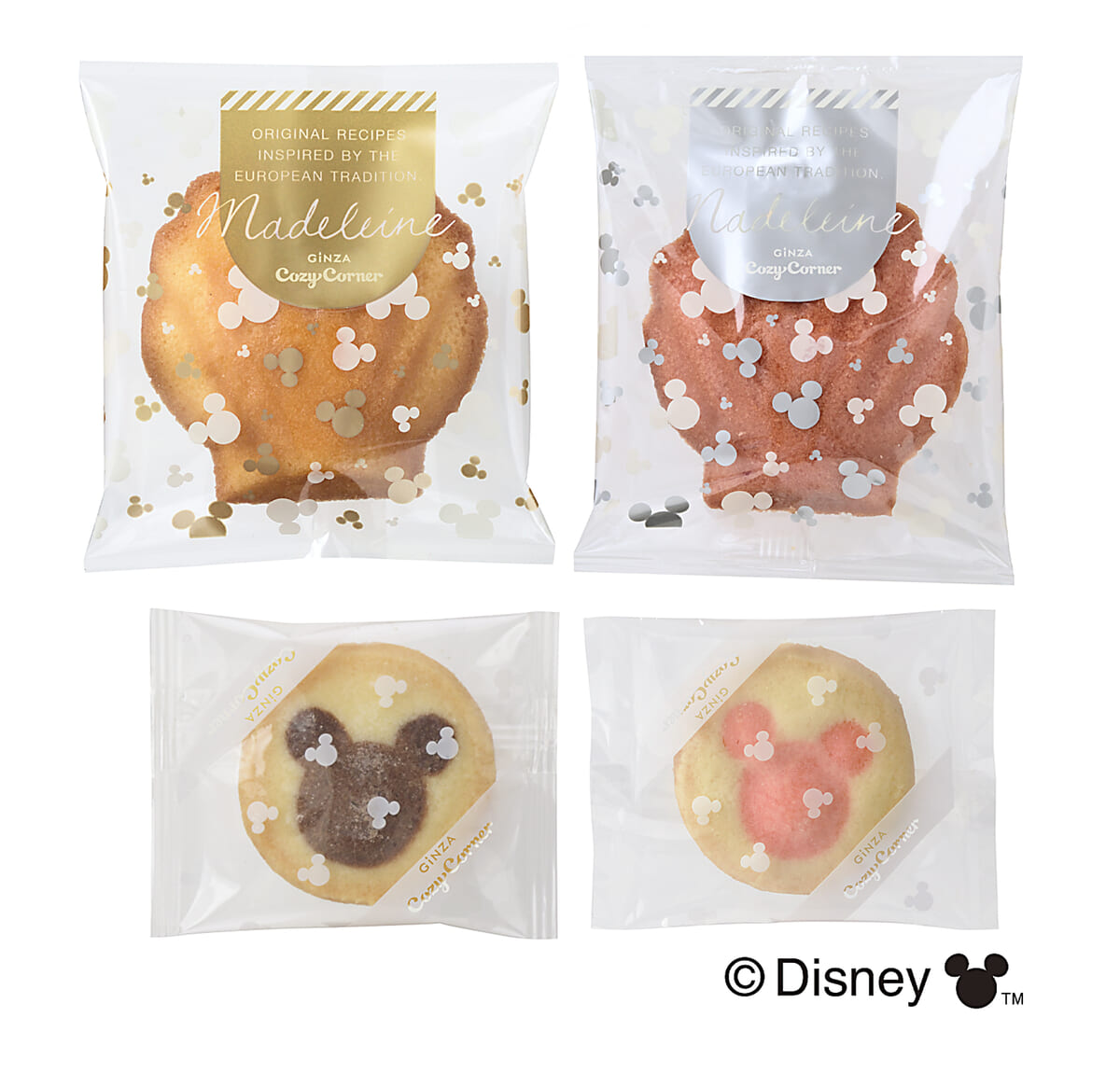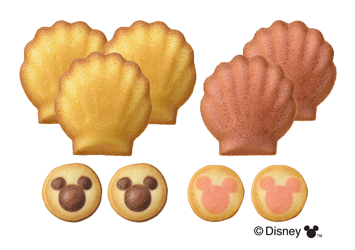 アソートの焼菓子は、ふんわりしっとり焼き上げたバター味・いちご味のマドレーヌと、サクサク食感の「ミッキー」アイコン柄クッキー2種。