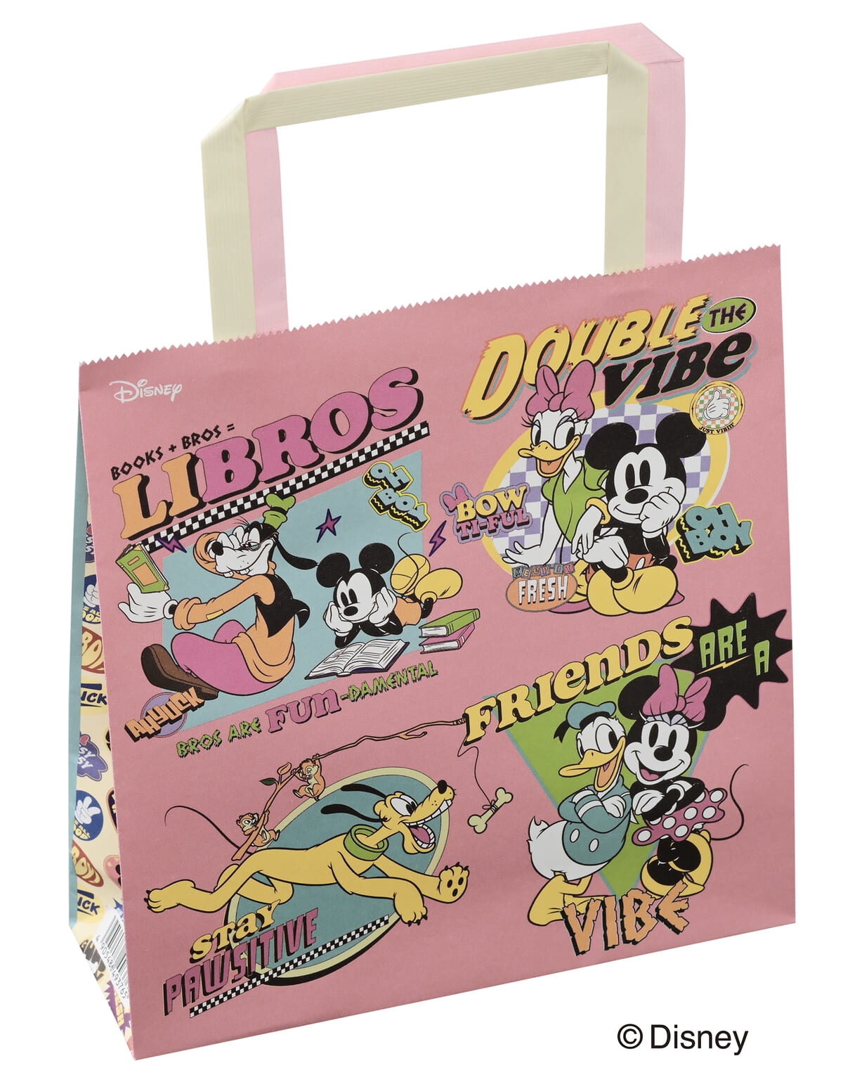 お互いの持ち物を交換しておしゃれを楽しむ「ミッキーマウス」と「グーフィー」、おやつの時間を楽しむ「ミニーマウス」と「プルート」など、いつもとは異なる組み合わせのミッキー&フレンズがワッペン風にデザインされています。