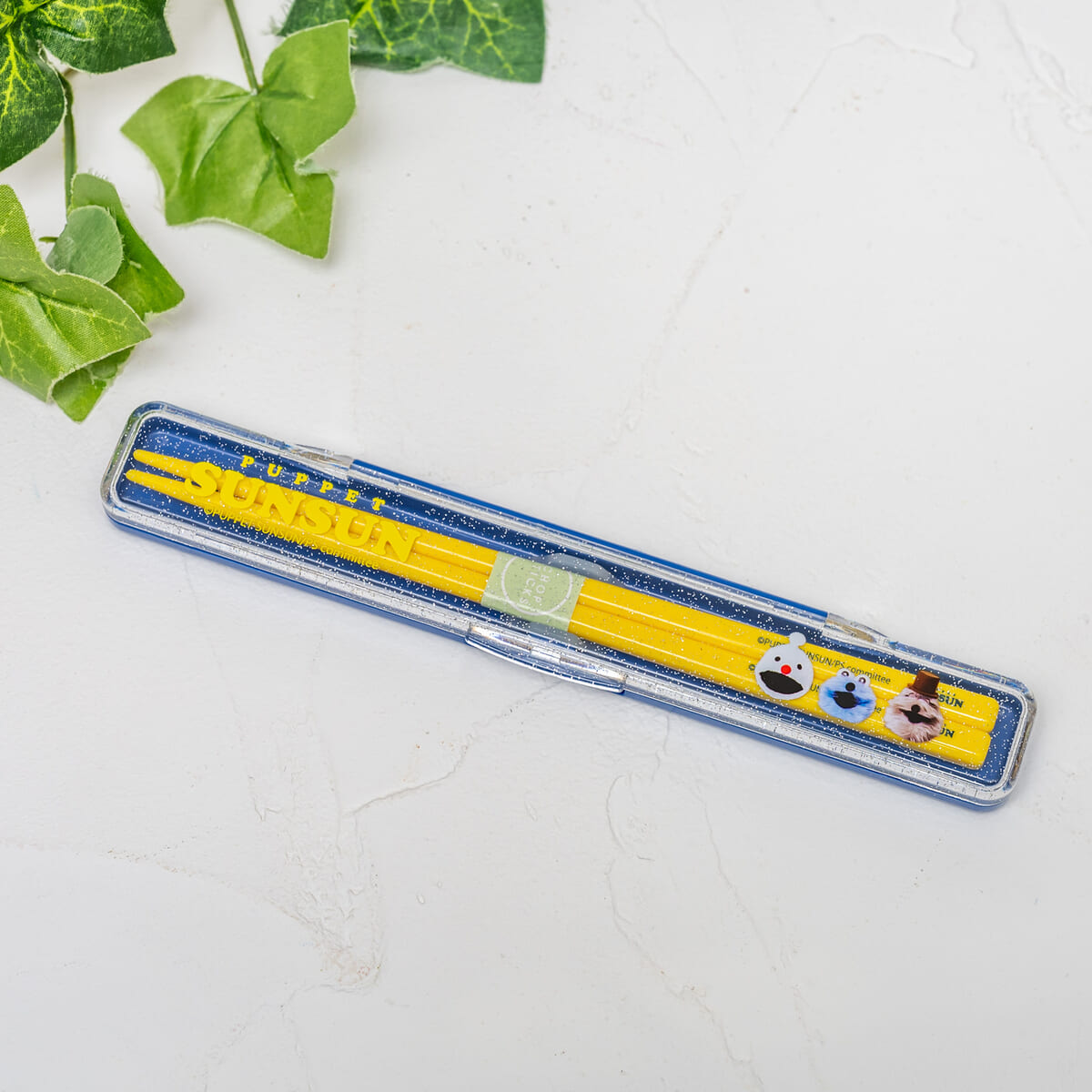 ブルーを基調とした爽やかなカラーリングに「PUPPET SUNSUN」のロゴや「スンスン」の表情豊かなイラストがあしらわれています。